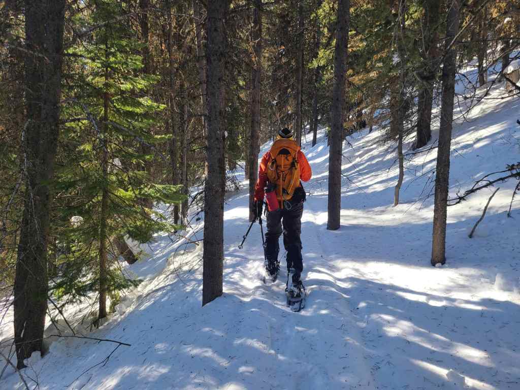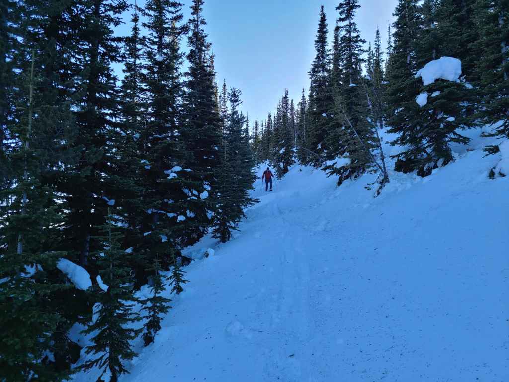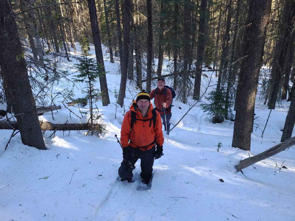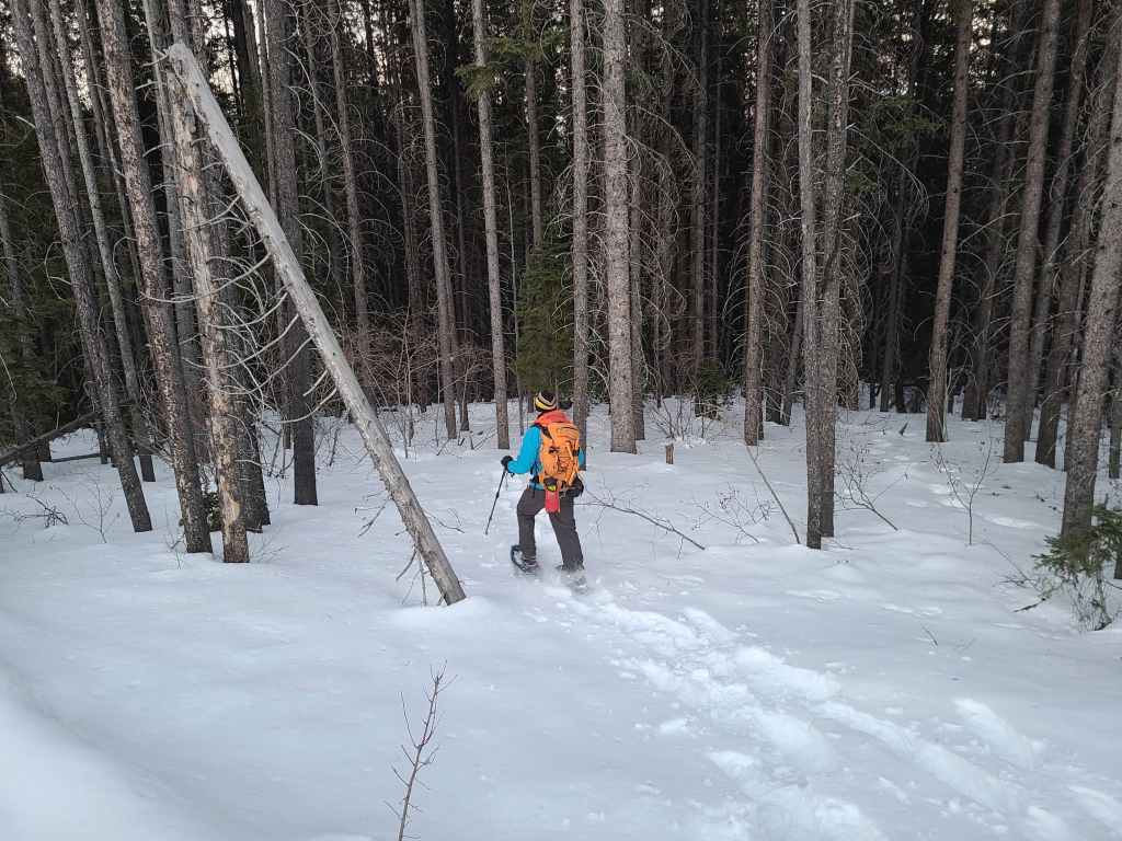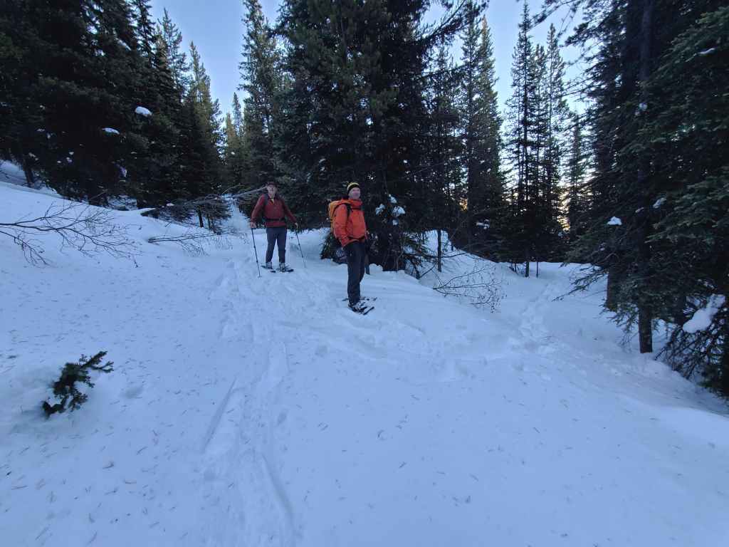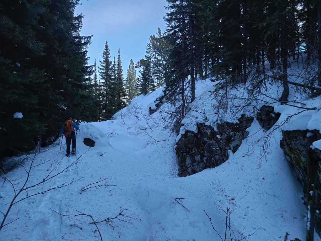 After crossing Michel Creek, we immediately headed into the trees where we followed a small drainage upwards for ~2 km until we emerged onto a reforested area. We then snowshoed for another ~ 185 m, until we emerged onto a logging road that also doubles as a snowmobile route. Instead of following the road, we continued across it and re-entered the new growth forest, trending climber’s right for ~280 until we joined an offshoot of the first logging road. Doing this shaved close to 1 km off the trip.