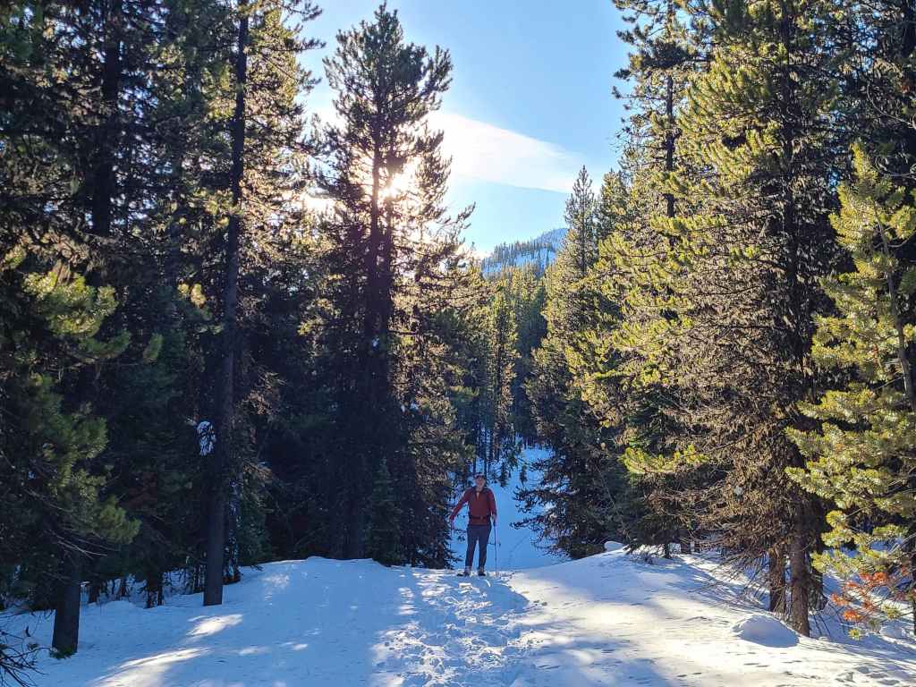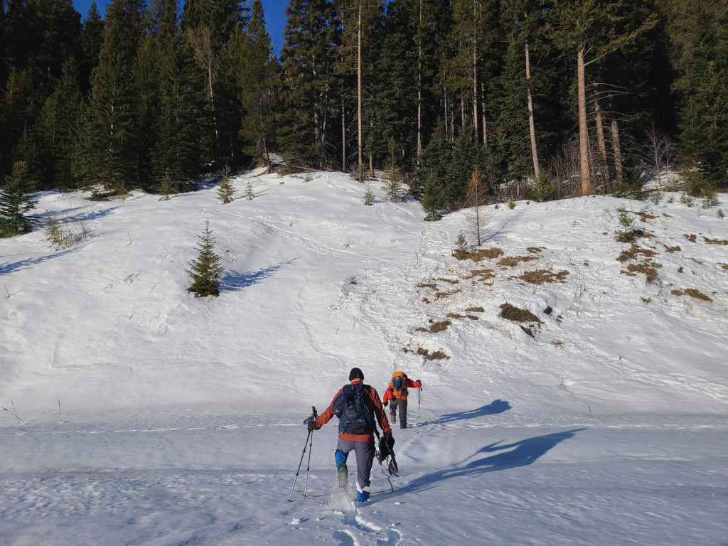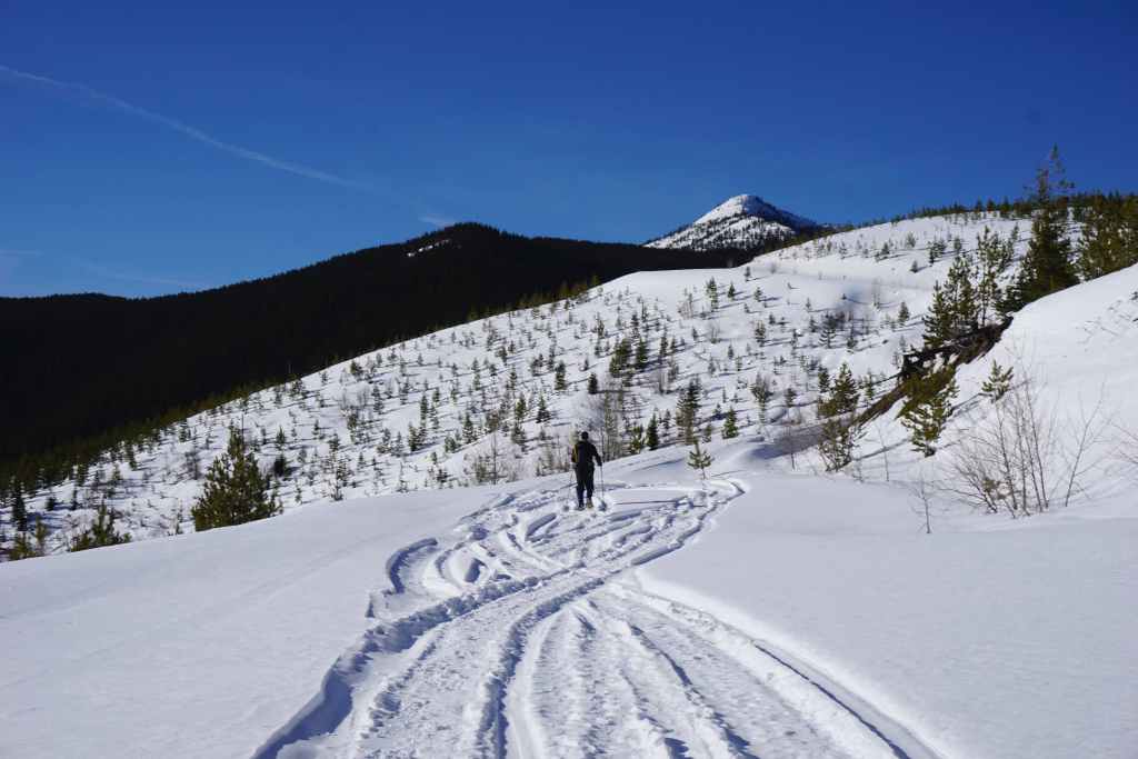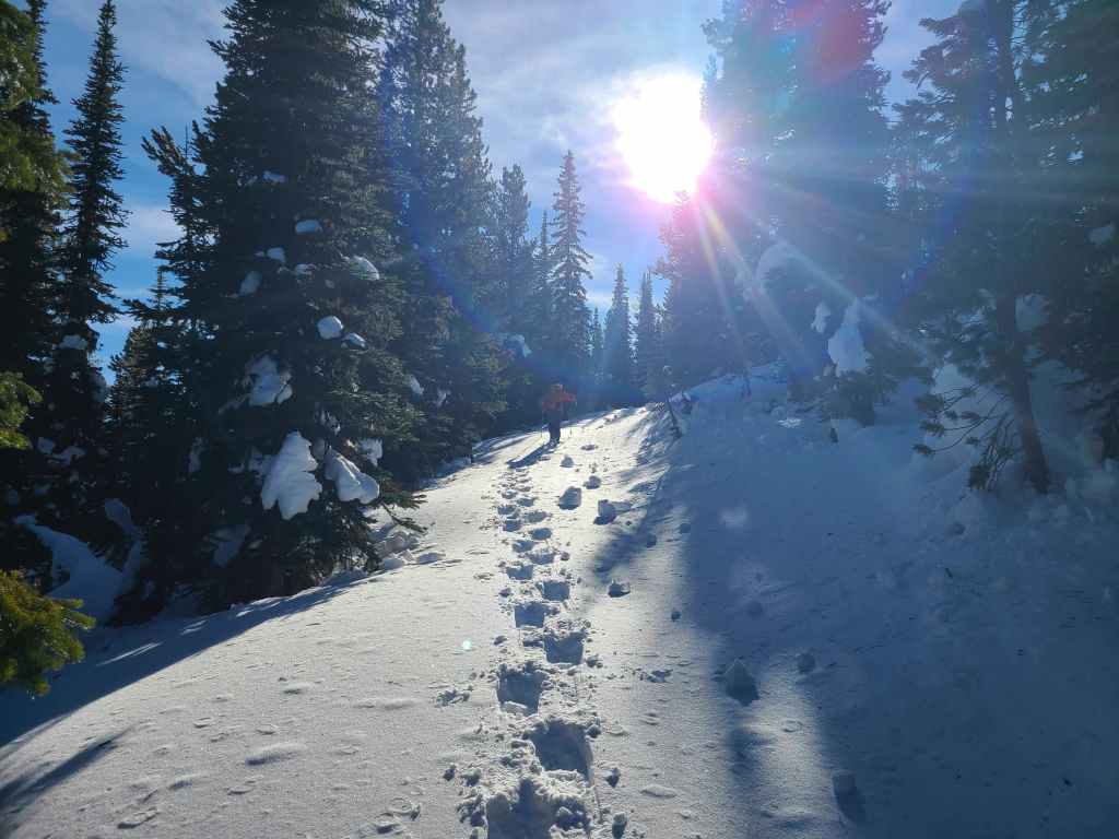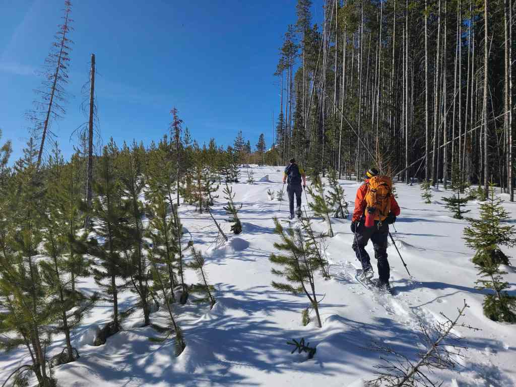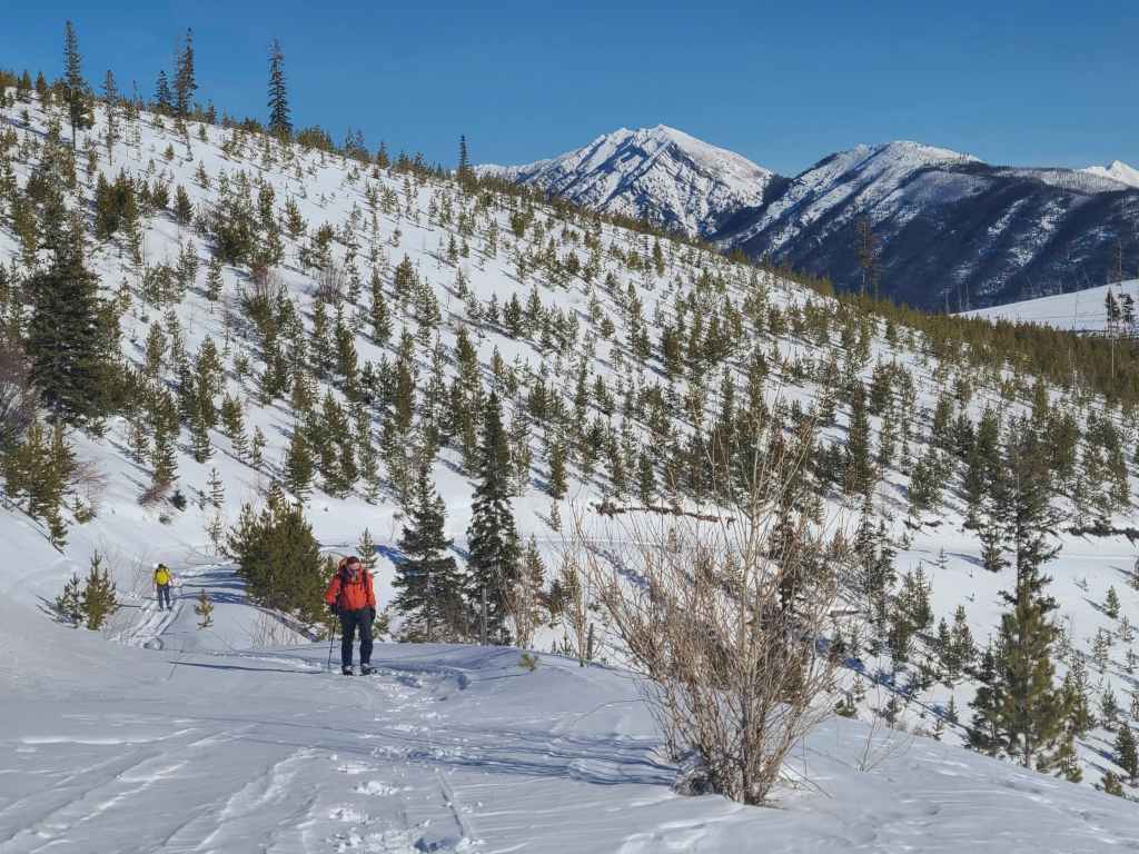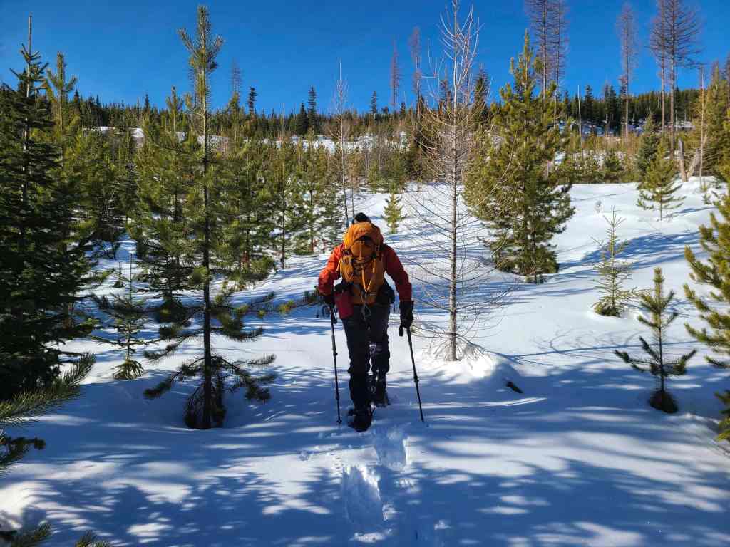 After crossing Michel Creek, we immediately headed into the trees where we followed a small drainage upwards for ~2 km until we emerged onto a reforested area. We then snowshoed for another ~ 185 m, until we emerged onto a logging road that also doubles as a snowmobile route. Instead of following the road, we continued across it and re-entered the new growth forest, trending climber’s right for ~280 until we joined an offshoot of the first logging road. Doing this shaved close to 1 km off the trip.