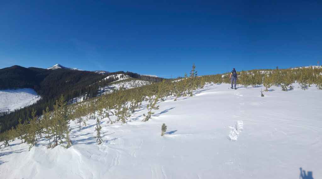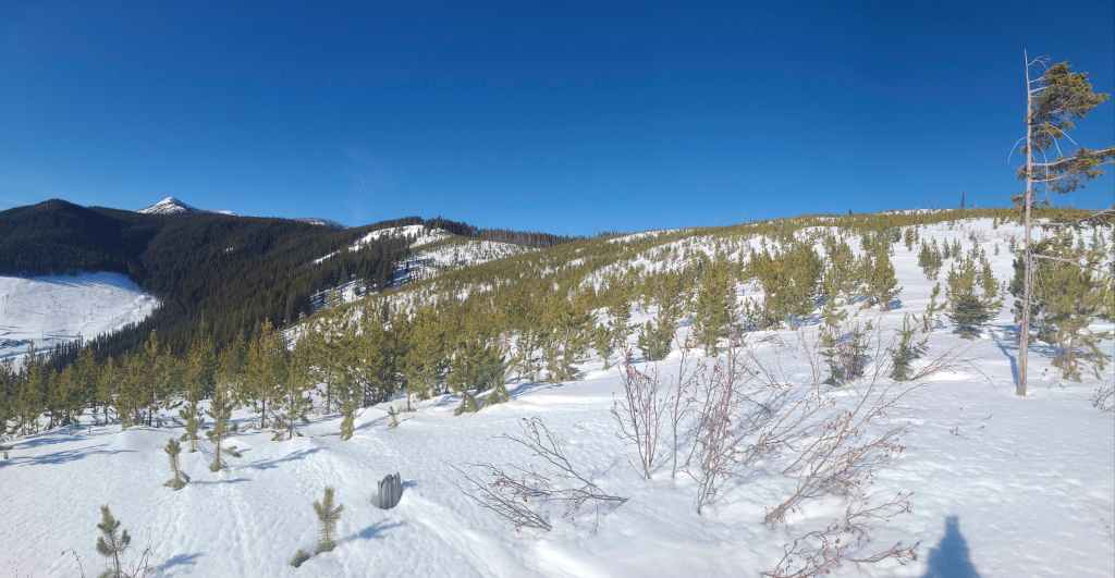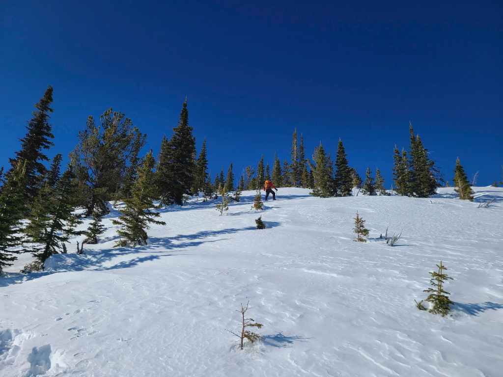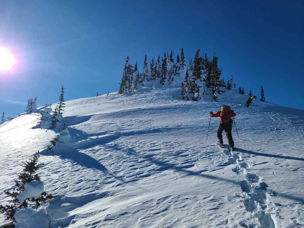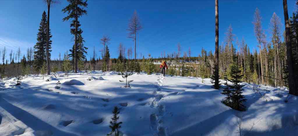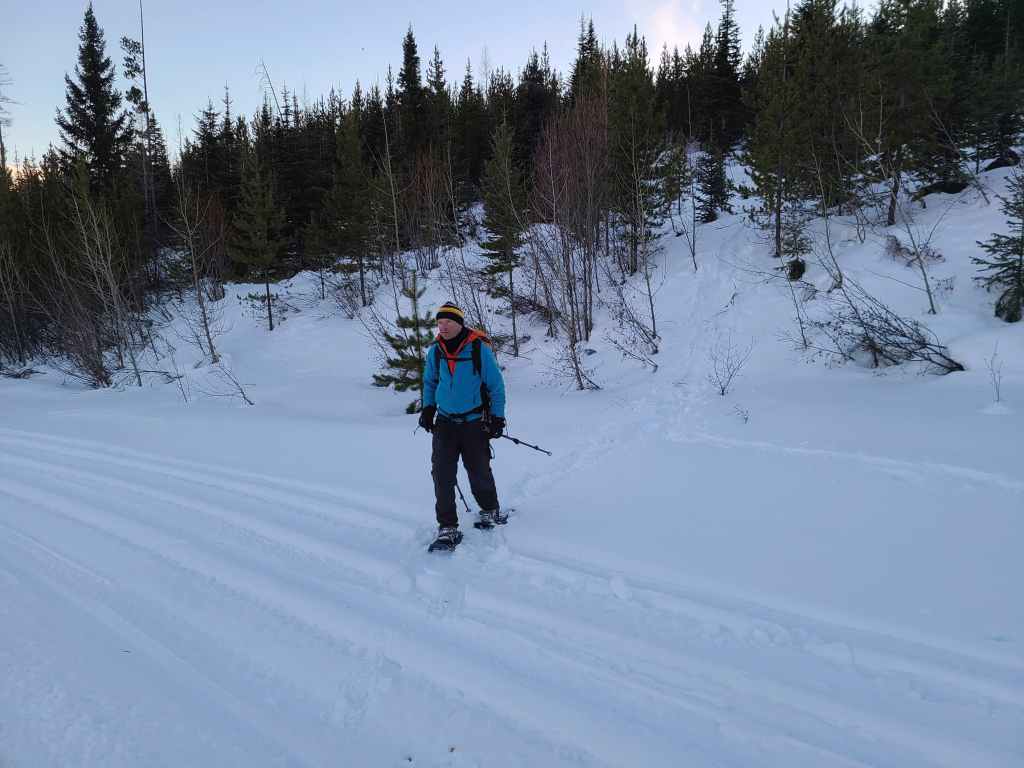 We then followed the road for ~1.2 km onto the northeast ridge. Though the road ends before reaching the crest, we were able to make quick work of the ~500 m snowshoe over to the crest itself. From here, we then followed the ridge through light forest for ~560 m, until we came to a flagged snowmobile trail.