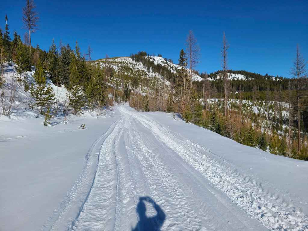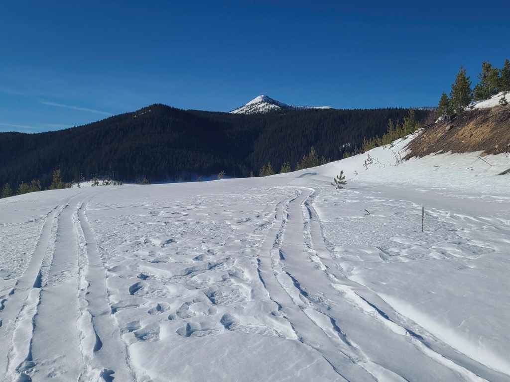We then followed this trail as it led us up and alongside the east side of the ridge. Approximately ~850 m from where we joined it on the ridge, the trail intersected with a larger road. Here, we turned right and onto the road which we would follow for ~ 2 km until it completely disappeared under deep snow beneath the summit.