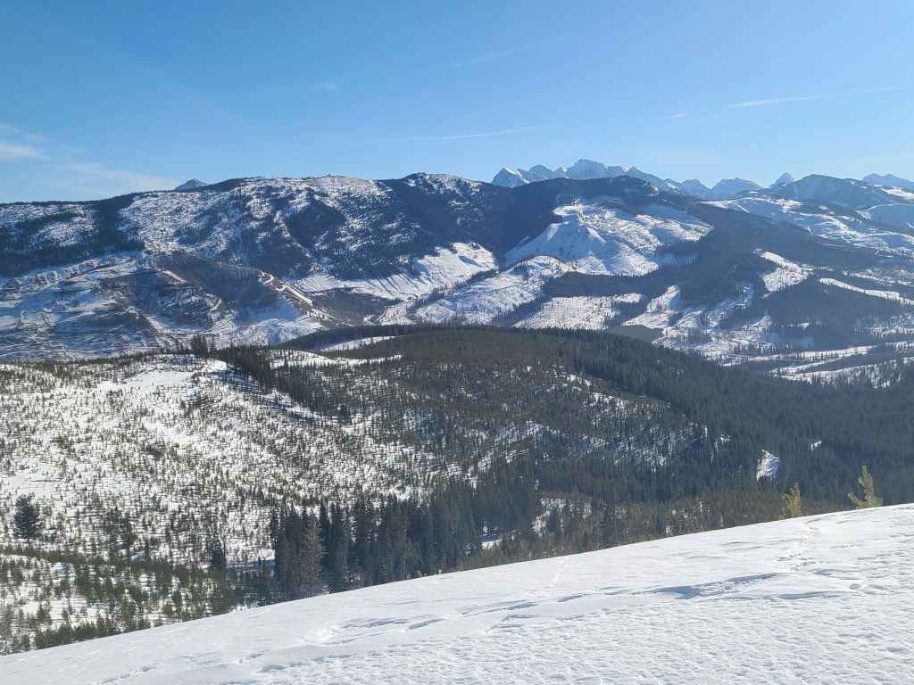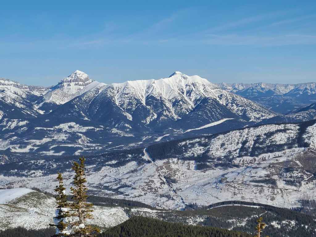 Indeed, my ideal west route was always to gain the northeast ridge via its open slopes that start immediately on the other side of Michel Creek, approximately 2 km from Highway 3. Once on the ridge proper, we would then follow it all the way to the summit, utilizing snowmobile trails and logging roads wherever possible. However, deep snow prevented us from driving down the short access road to banks of Michel Creek, let alone parking safely alongside the highway. So, we ended up very close to where Matt, Sandra, Allison, and Vern had started.