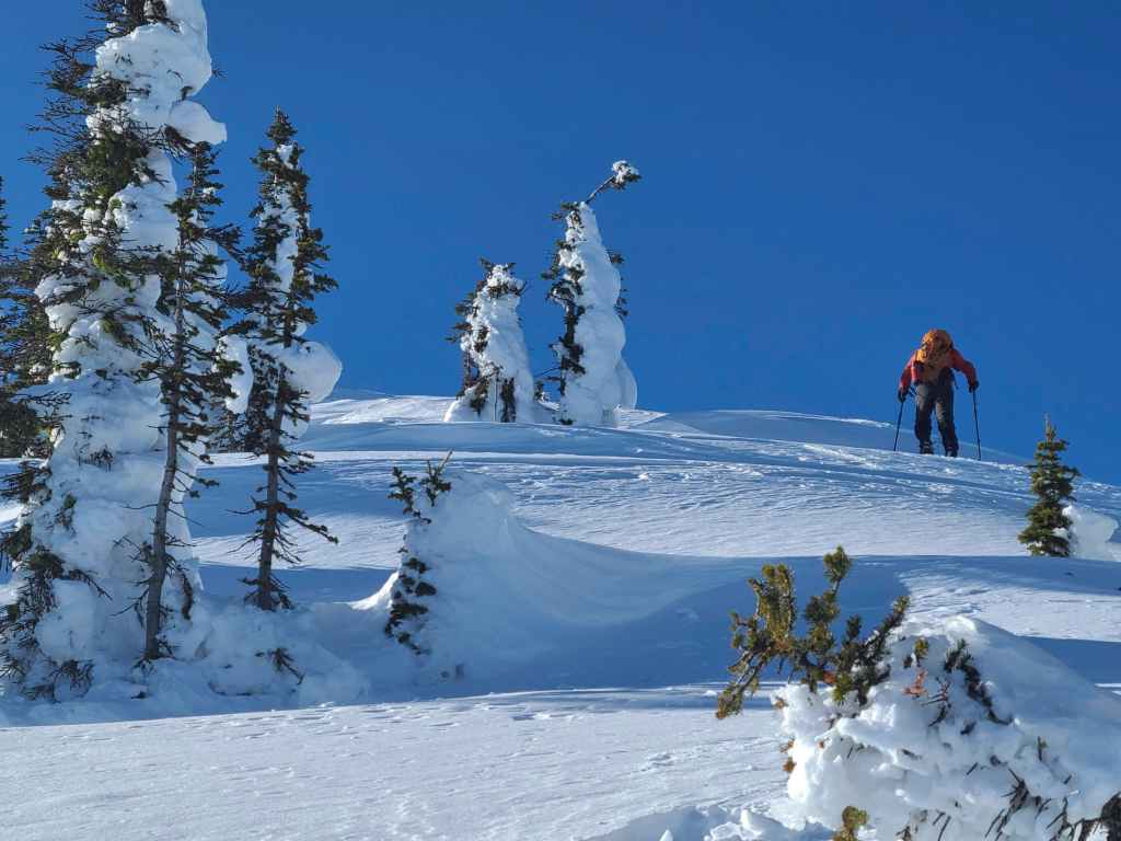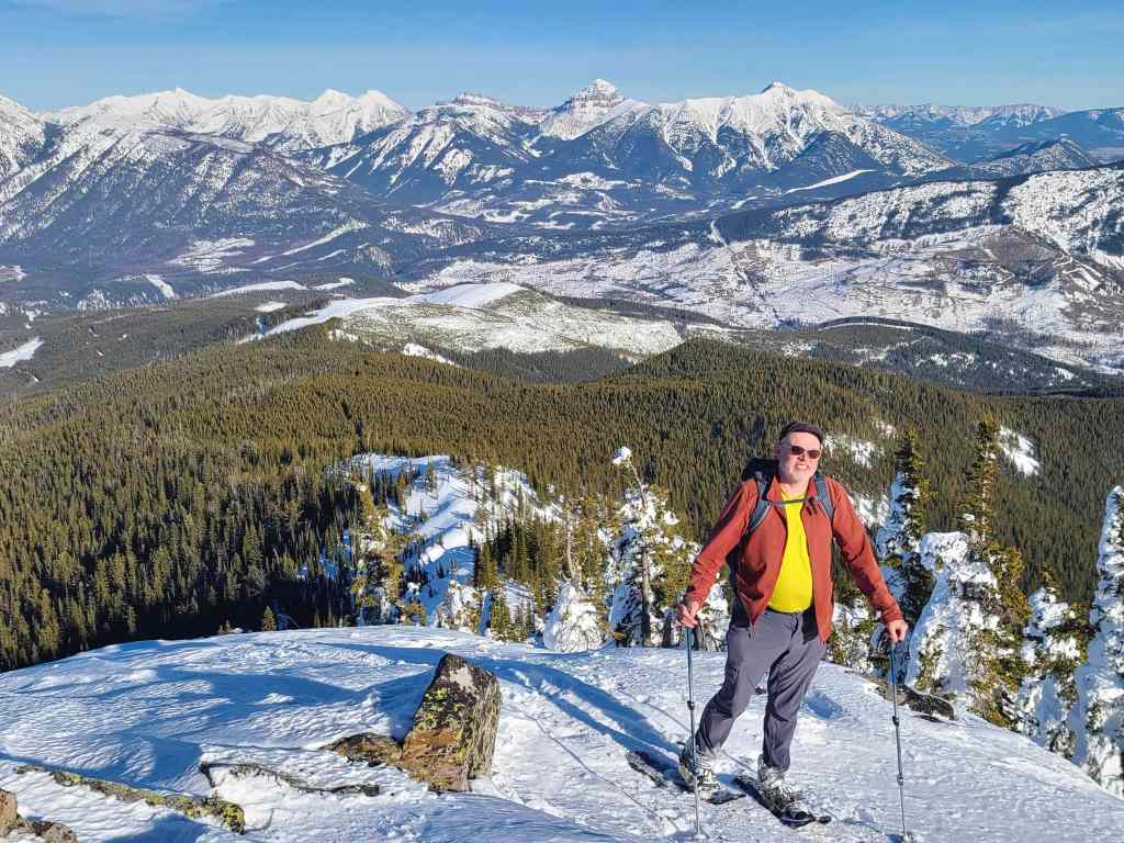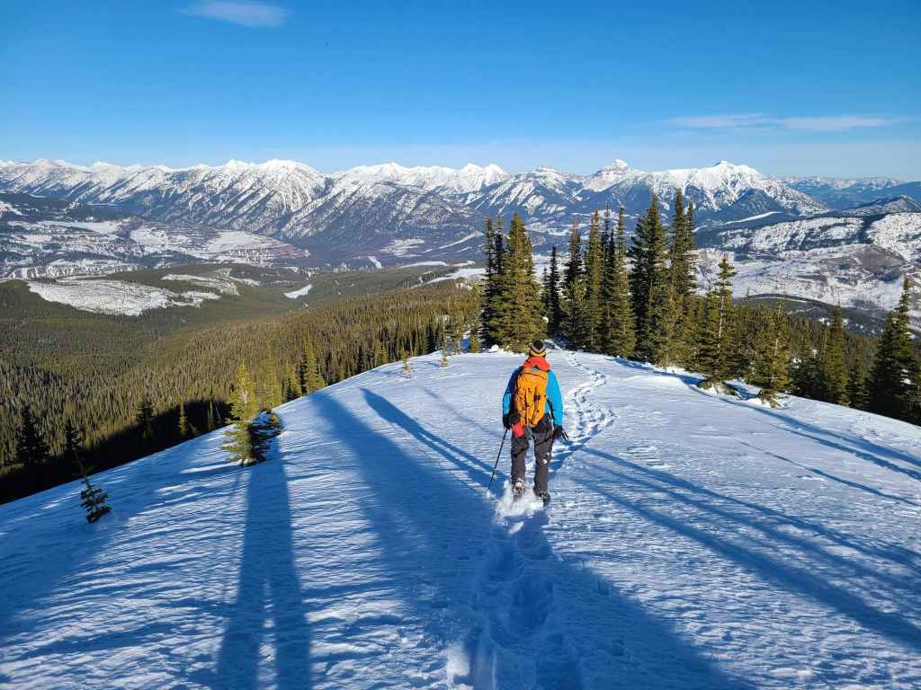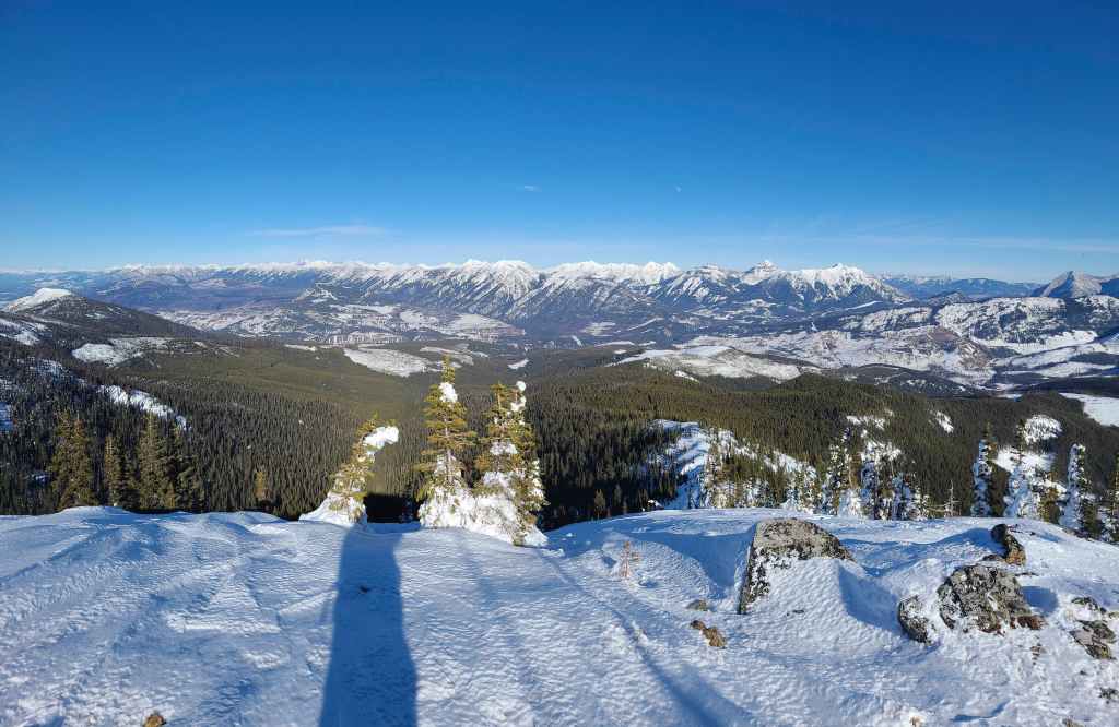 Raff makes his way down the final slope before reaching our vehicles. After enduring inclement weather on recent trips, having a bluebird was an absolute gift! Being able to snowshoe in a t-shirt with blue sky overhead and crisp snow underneath – with no wind whatsoever – made this into a great day. Throw in some 360 views from the top and some fantastic companions for the journey, and it instantly became an incredible day! Make no mistake, this was a long day, as 1000+ m of elevation gain on snowshoes will ensure a good night’s sleep, but thanks to trip reports from Matthew Clay, Alison Sekera, and Vern Dewit, we knew what to expect and could choose an alternate route. Thanks again to Raff and Bert for such an awesome day in the mountains! 😁