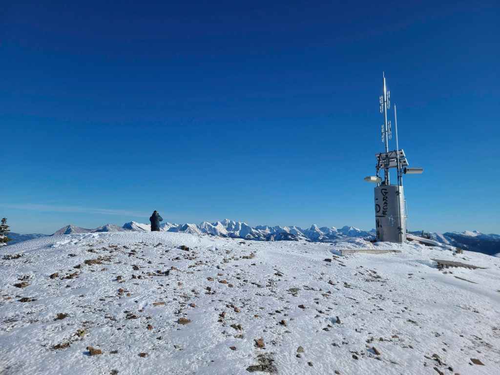 As soon as the road disappeared, we hiked a steep slope until we were on the crest of the ridge and facing the summit. Another steep (avalanche possibility), but scenic snowshoe of ~350 m brought us onto the summit. We then returned the way we came and because it was almost entirely downhill, it went very quick.