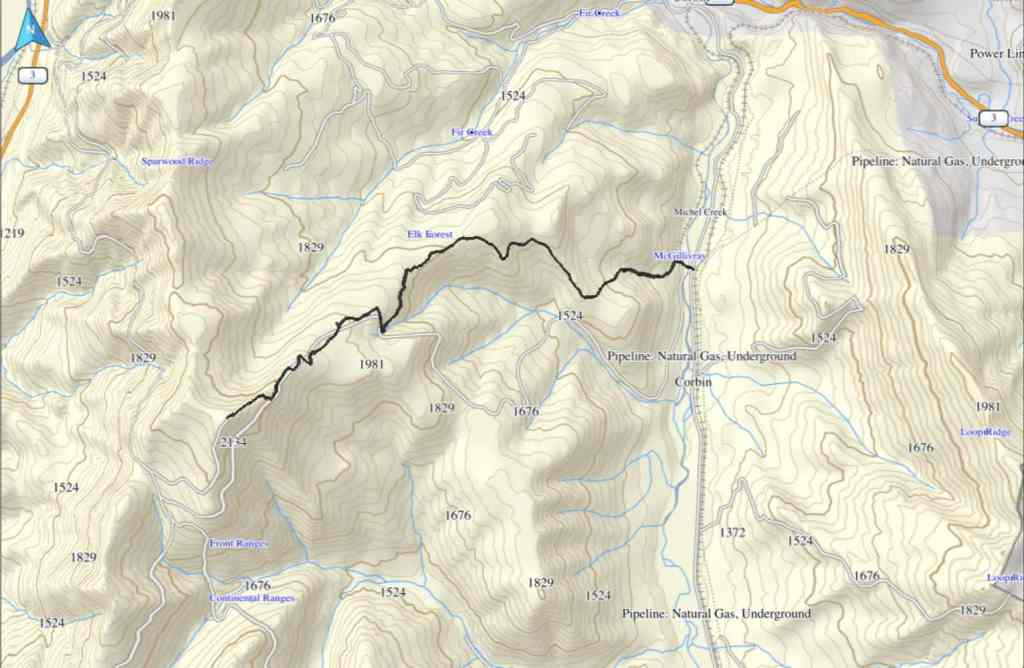 To get to the summit of Sparwood Ridge (a.k.a. the the Natal Fire Lookout ) we drove west on Highway 3 from the Crowsnest Pass until we came to the Corbin Road turnoff. We then turned onto the road and drove for another ~4 km until we came to a small parking area on our left between two sets of railway tracks. This was our starting point.