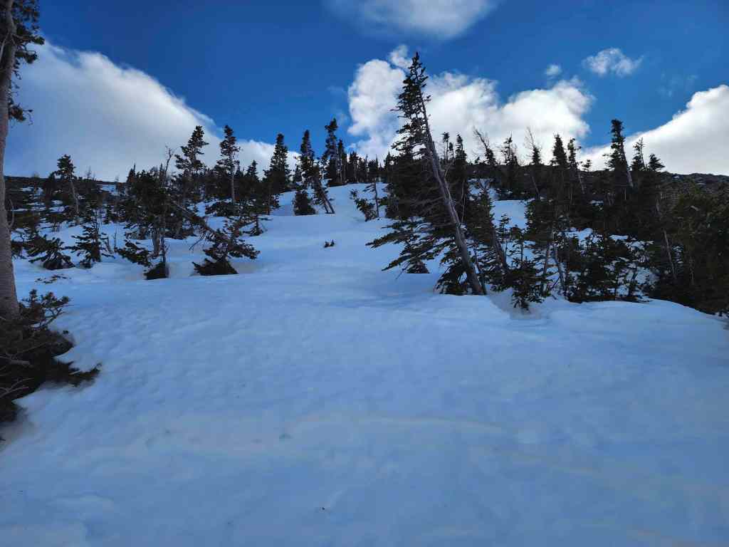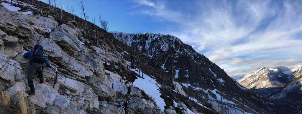 In hindsight, we should have kept as far to skier’s right as possible. This would have allowed us to avoid a cliff band along with the time it took to traverse above it.