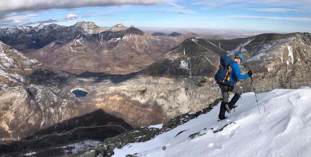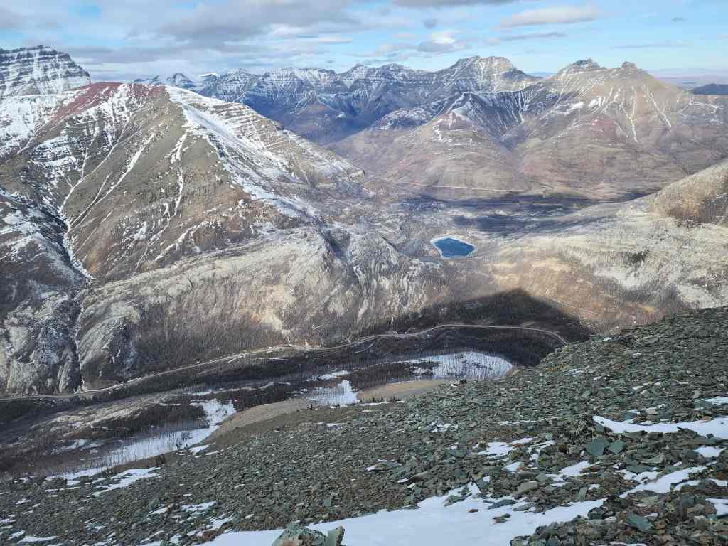 There are lots of options for ascent and descent such as So Nakagawa’s 2012 trip, but we chose to use Andrew’s November 2020 route because we thought it would make for an easier loop. This saw us start from parking lot for the First Oil Well in Western Canada National Historic Site, and head more or less in a straight line to gain the ridge. We then descended directly from the summit onto a large, ramp-like cliff band near the Parkway. This cool natural feature, led us back to our starting point.