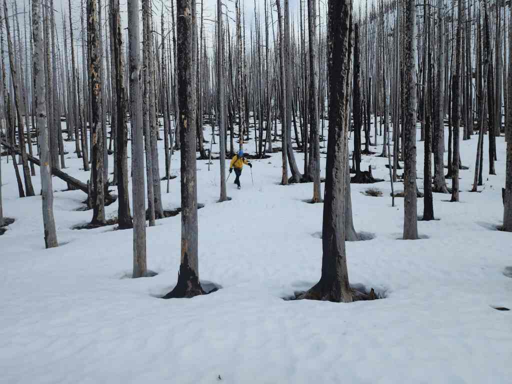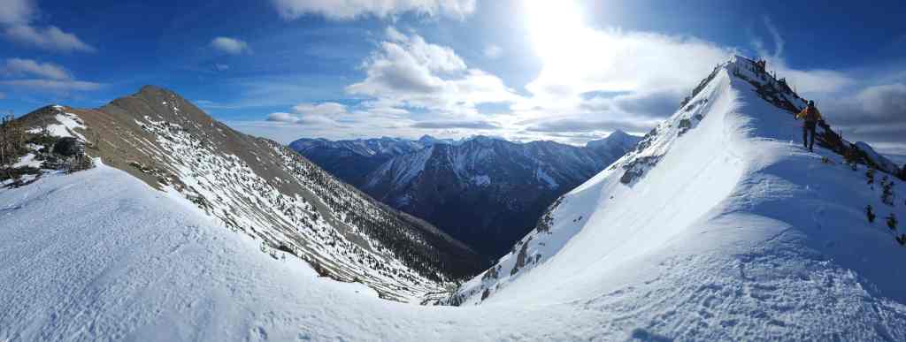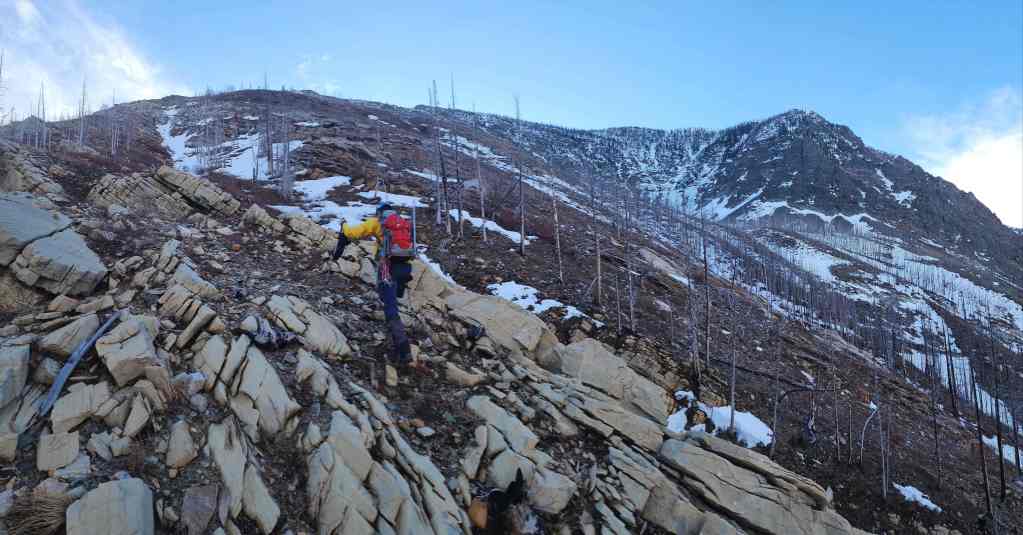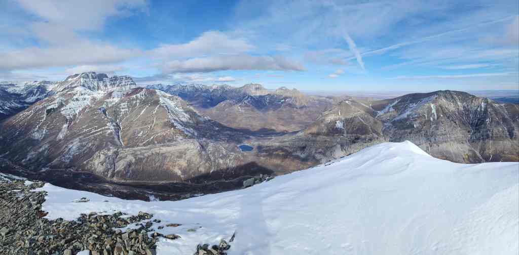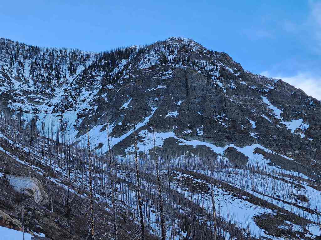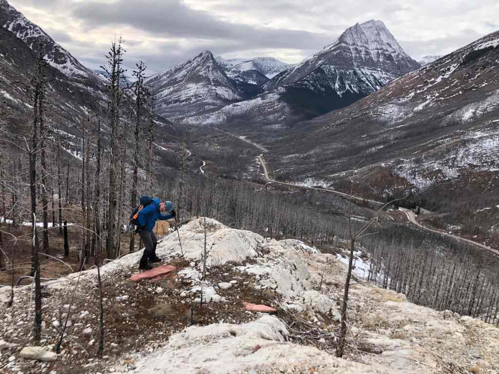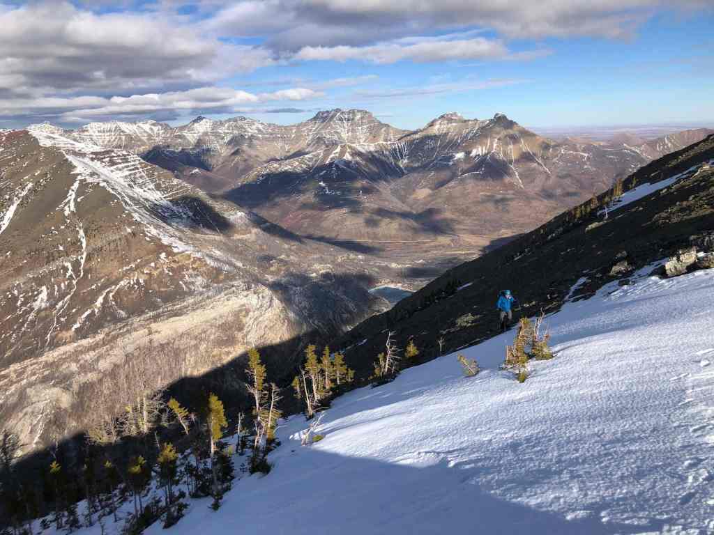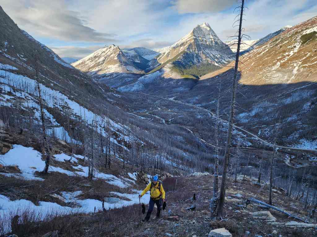 To descend, we dropped down the north slopes directly beneath the summit. In hindsight, we should have stayed as close to the end of the ridge as possible (skier’s right), because this would have allowed us to avoid a large cliff band. Once on the second cliff band, it was an enjoyable ~2 km hike along a natural ramp back to Cameron Creek and our vehicle.