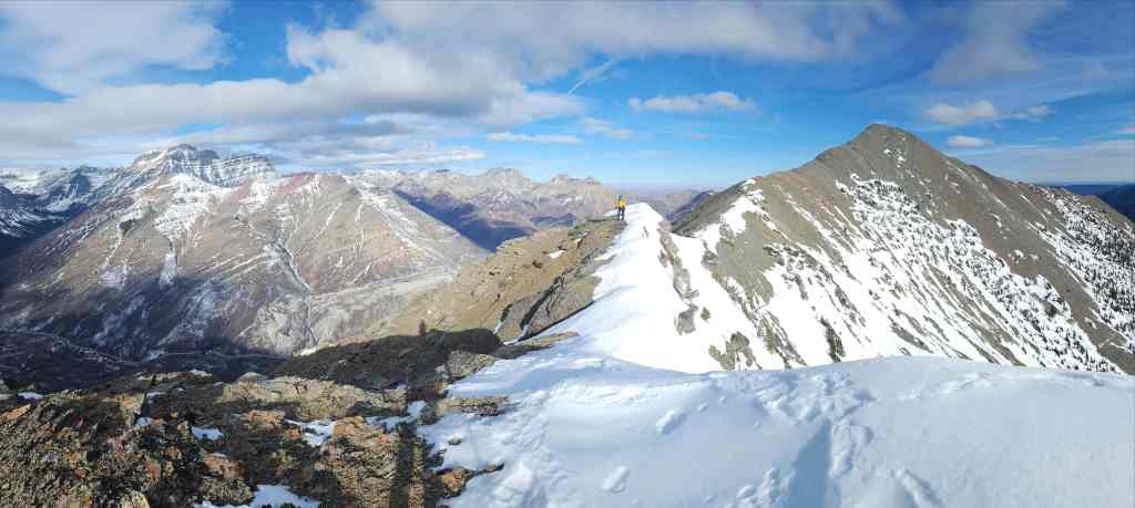Finally! 😁 After years of planning to ascend the northeast end of Buchanan Ridge as a shoulder season or winter hike – and then backing off because of weather – I finally caught a break. An unseasonably warm and windless day allowed Andrew and I the chance to ascend this prominent (2424 m) peak under enjoyable, but concerningly snowless conditions.
