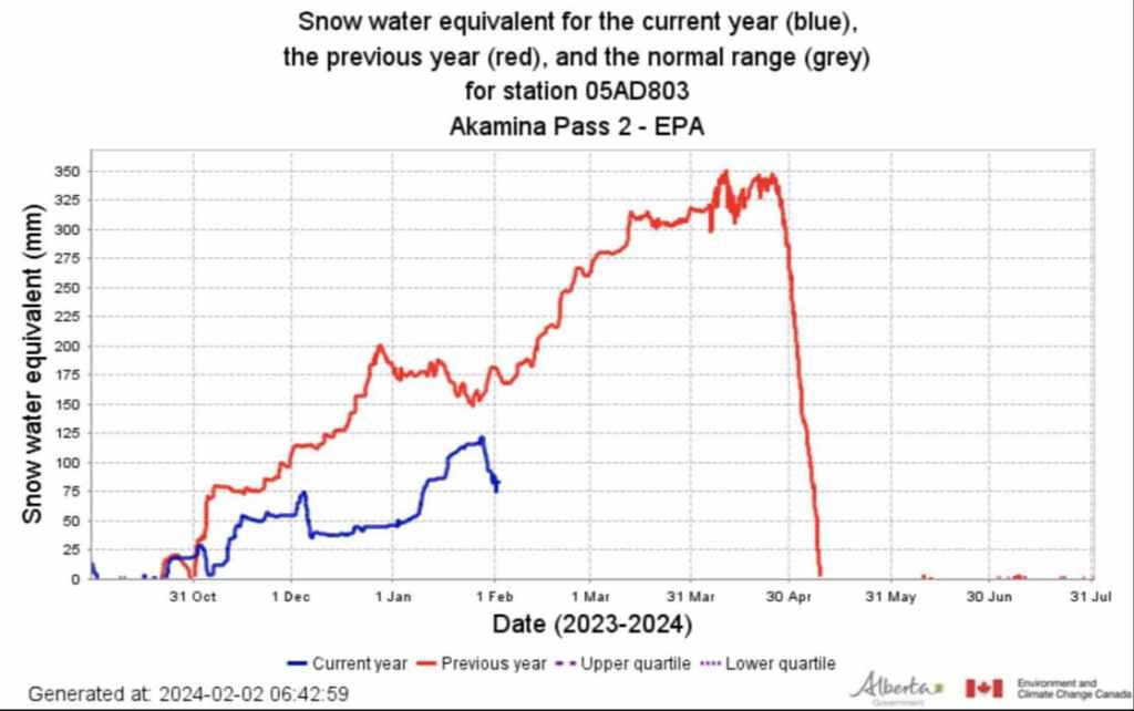 Since southern Alberta relies on snowmelt for its water supply, this is very concerning. Moreover, the publicly available data from the Akamina Pass snow pillow, validates this. This snow pillow along with the Flattop Mountain pillow are used by the Province of Alberta to help forecast water for the upcoming year. Data from the morning of February 2, 2024 demonstrates that we are significantly behind last year’s snowpack, and last year was a dry year. Unless we have a dramatic rally of precipitation over the next few months, we will undoubtedly experience water restrictions. On the hiking side, the upcoming dry conditions may be enough for the government to limit backcountry travel due to fire risk, but that’s just speculation on my part. The bottom line is that we need a lot more snow combined with a slow spring melt.