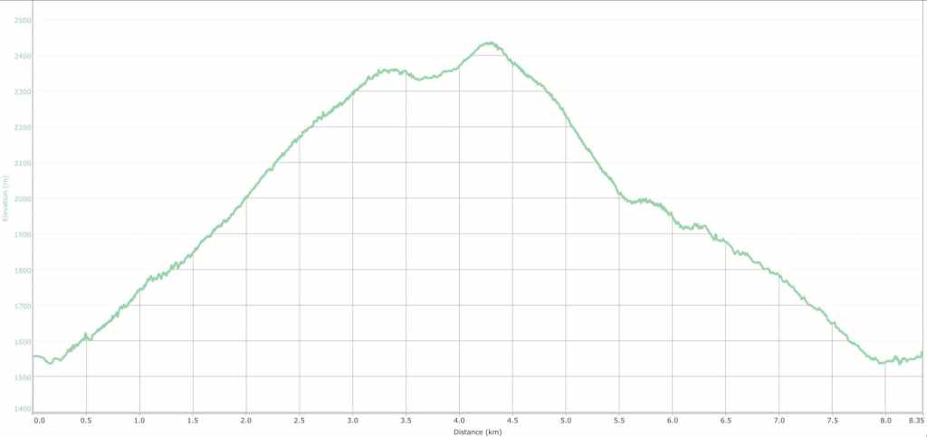 Our total roundtrip distance was 8.3 km with a total roundtrip time of 5 hours and 38 minutes. Our total elevation gain came in at 860 m.