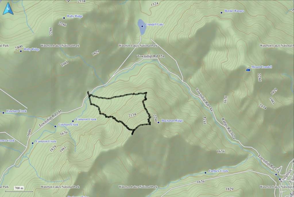 To get to Buchanan NE, we drove ~8km from the Waterton townsite along the Akamina Parkway until we arrived at the First Oil Well in Western Canada Historic Site. This was our starting point.