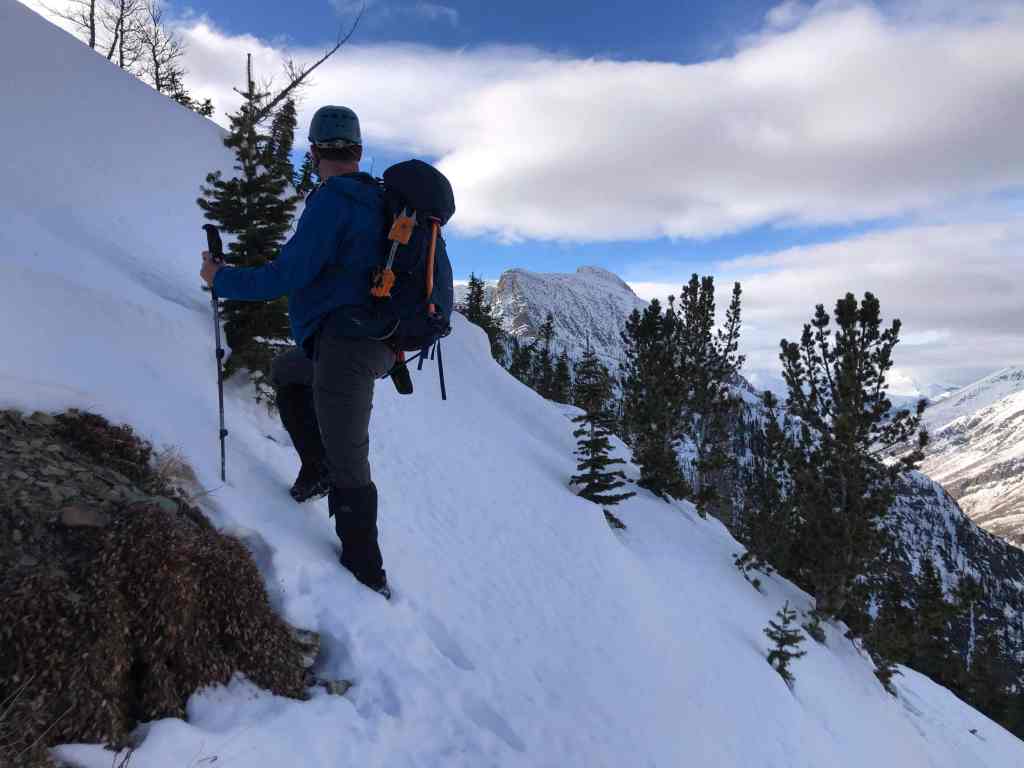 Traversing to skier’s right to bypass the cliff.