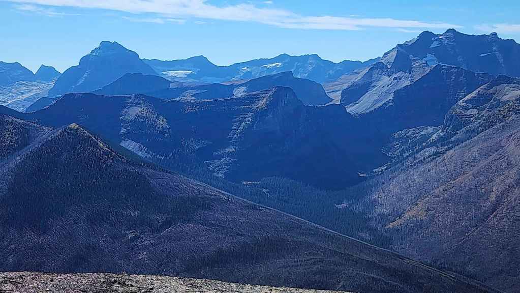 The view to the south. That interesting curved, little tower in the foreground to the right of centre is referred to by Mike Potter as a “cliff-girt outcrop” and he speculates that it’s a “nunatak: a feature whose summit was never glaciated”. (Ridgewalks in the Canadian Rockies, #130) When people say every mountain has been climbed by someone, it’s the truth. Indeed, Daniel Vanderpyl has posted an interesting ascent of it on Peakery. Huge thanks to Vern for pointing this out in his trip report.