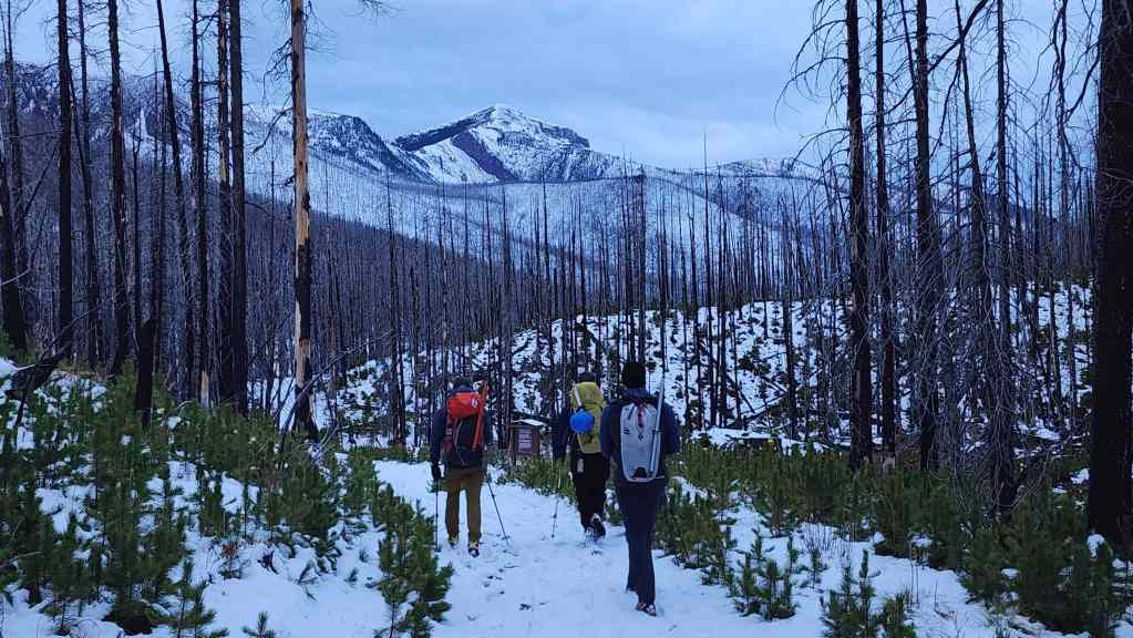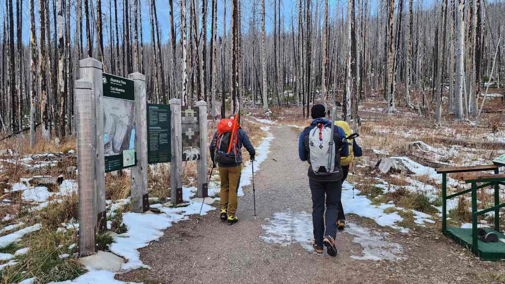To get to Mount Ashman we started from the Akamina Pass trailhead in Paahtómahksikimi (Waterton National Park) and followed the signed and easy trail for 1 hour and 18 minutes (5.5 km with a 193 m elevation gain) to its junction with the Bennett Pass trail at Wall Lake. From the lake we then followed the trail for 1 hour and 15 minutes (~2.7 km with a 505 m elevation gain) until we were standing on the trail above Bennett Pass.