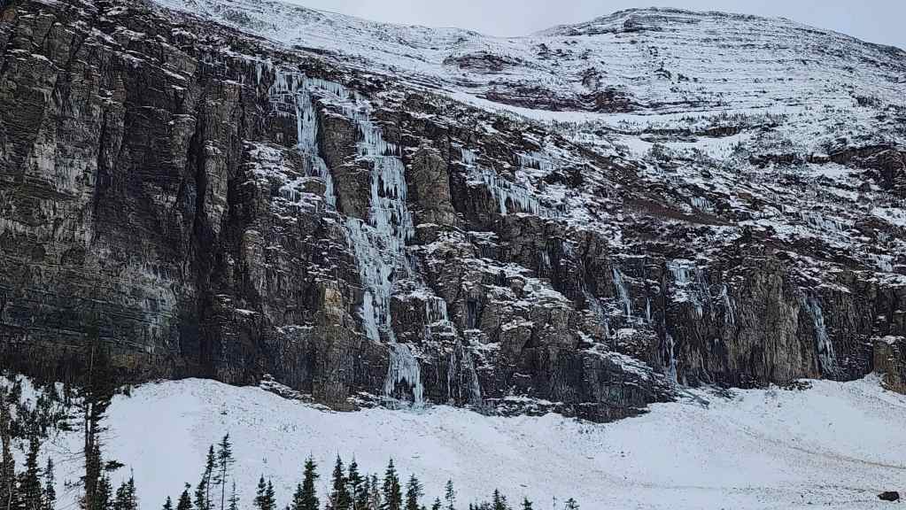 James stops to check out some frozen waterfalls forming on the cliffs in the centre.