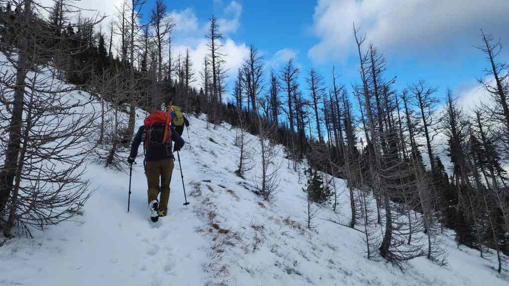 Heading up. Thankfully, the snow was not deep enough to force us into post-holing.