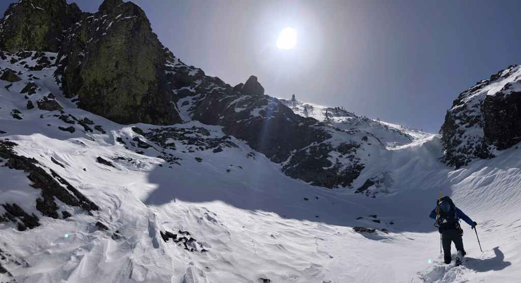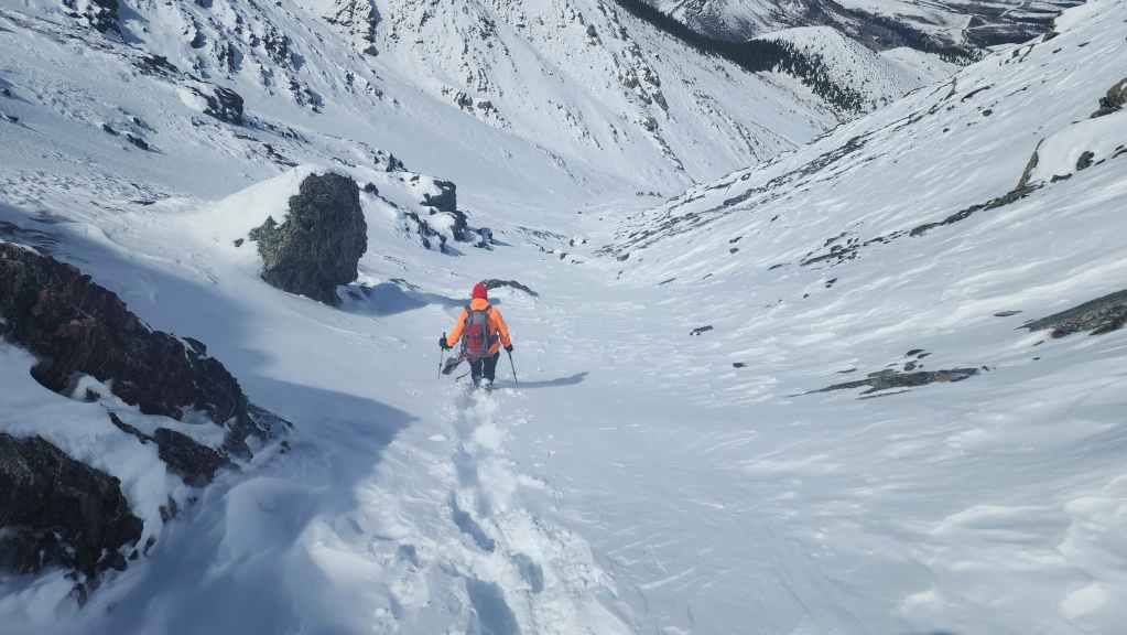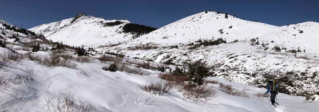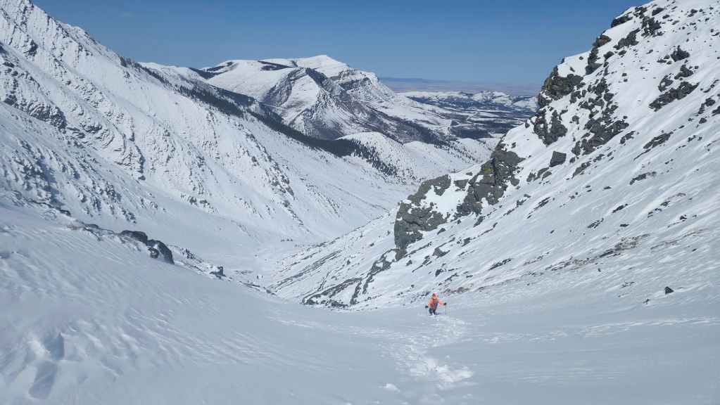 Emerging from the drainage and getting our first good look at Pincher’s Centre Peak.