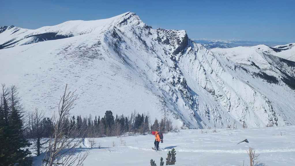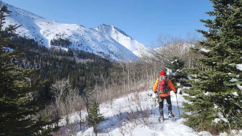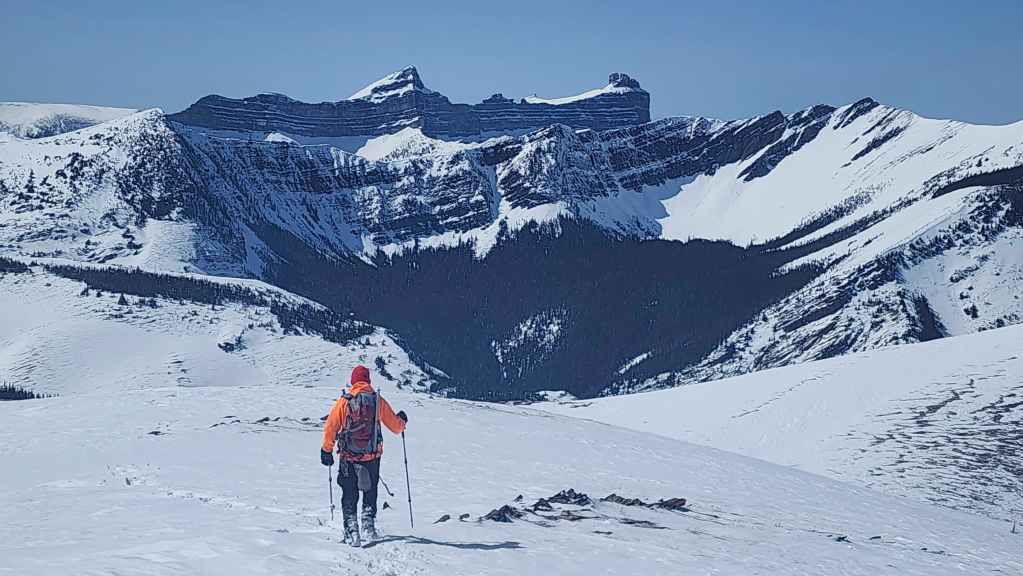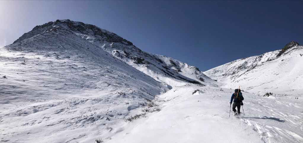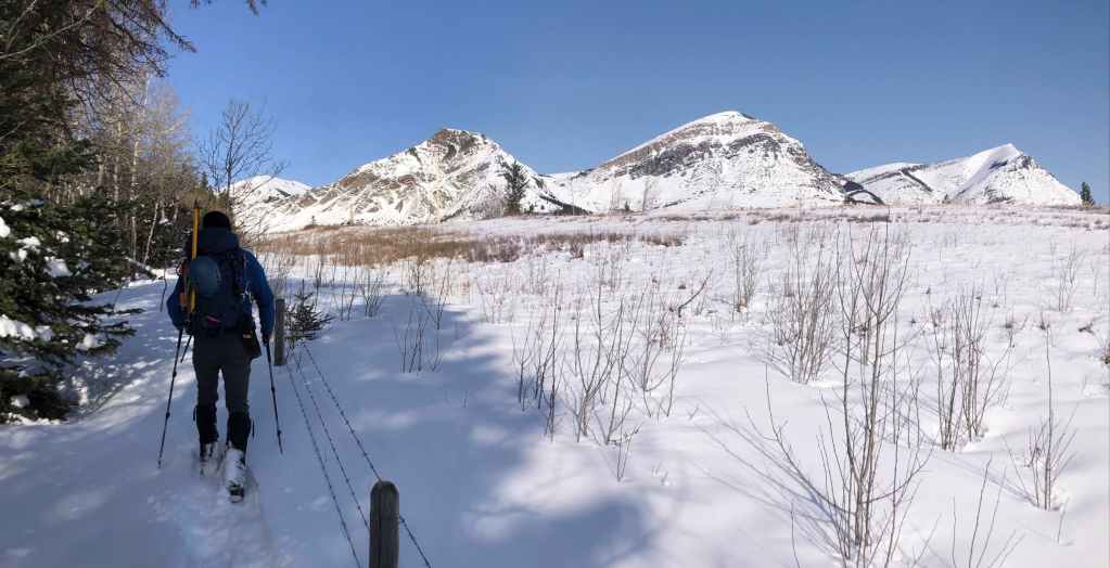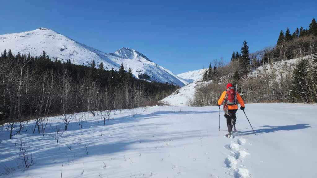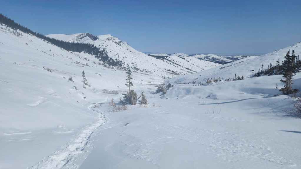 However, in typical southern Alberta fashion, with the blue sky came the wind, and so, after picking Andy up at his cabin, we discussed our options as we drove toward the front range peaks. Deciding that it would be best to stick to a sheltered approach, but also wanting to gain some decent elevation, we ended up choosing to repeat our January 2024 approach to the “The Horn”. This route follows the great trail that runs through the valley underneath the north side of Pincher Ridge; giving us three good options for the day: “The Horn”; Pincher Ridge’s Centre Peak; and Pincher Ridge itself.