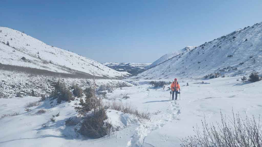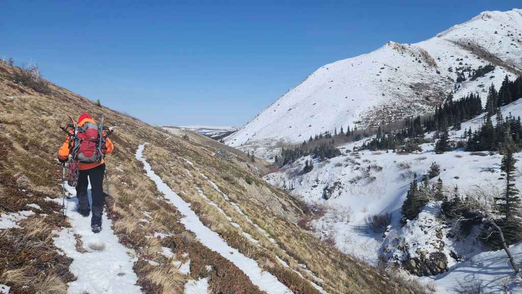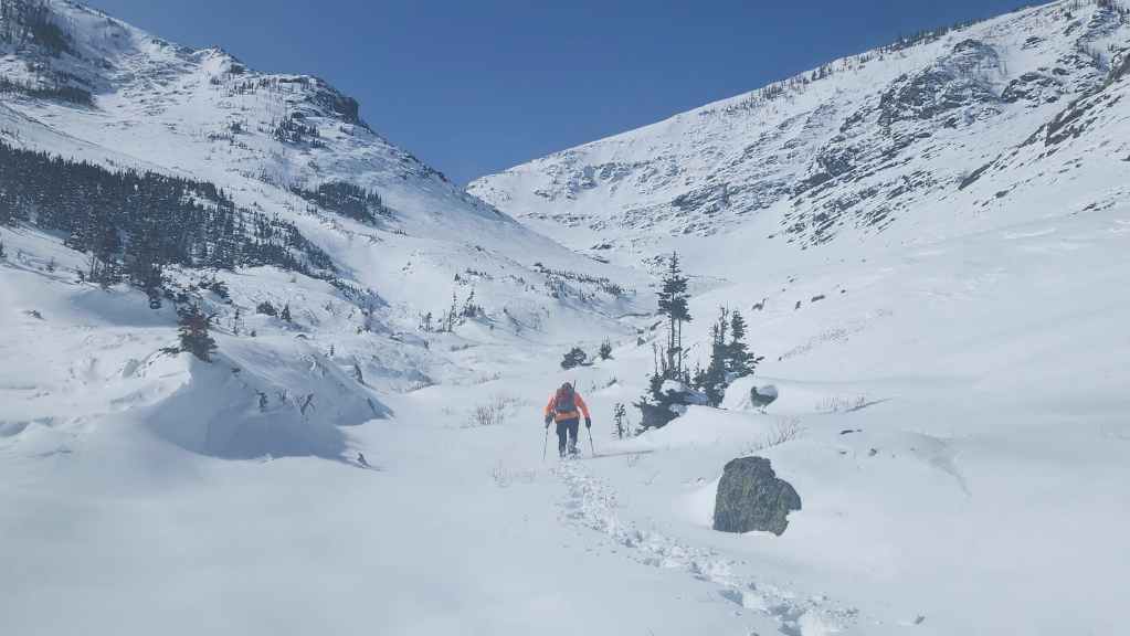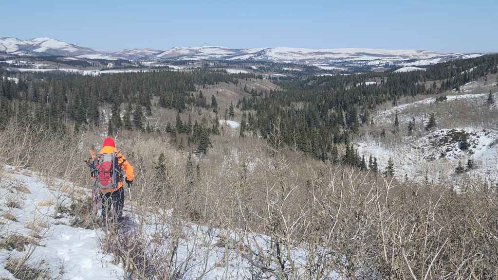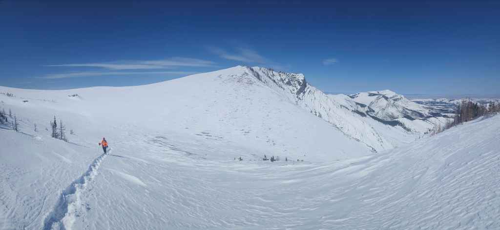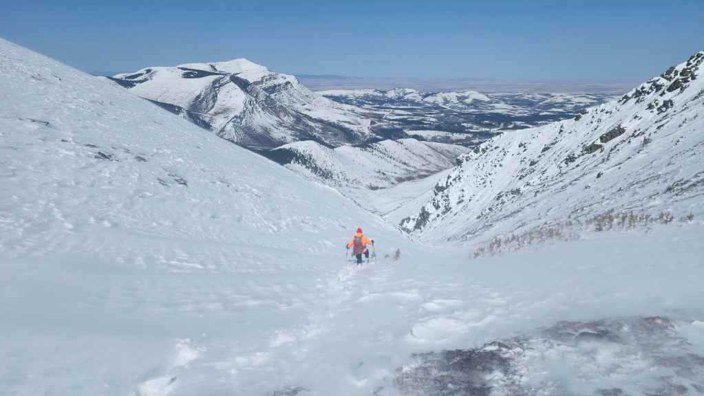 However, in typical southern Alberta fashion, with the blue sky came the wind, and so, after picking Andy up at his cabin, we discussed our options as we drove toward the front range peaks. Deciding that it would be best to stick to a sheltered approach, but also wanting to gain some decent elevation, we ended up choosing to repeat our January 2024 approach to the “The Horn”. This route follows the great trail that runs through the valley underneath the north side of Pincher Ridge; giving us three good options for the day: “The Horn”; Pincher Ridge’s Centre Peak; and Pincher Ridge itself.