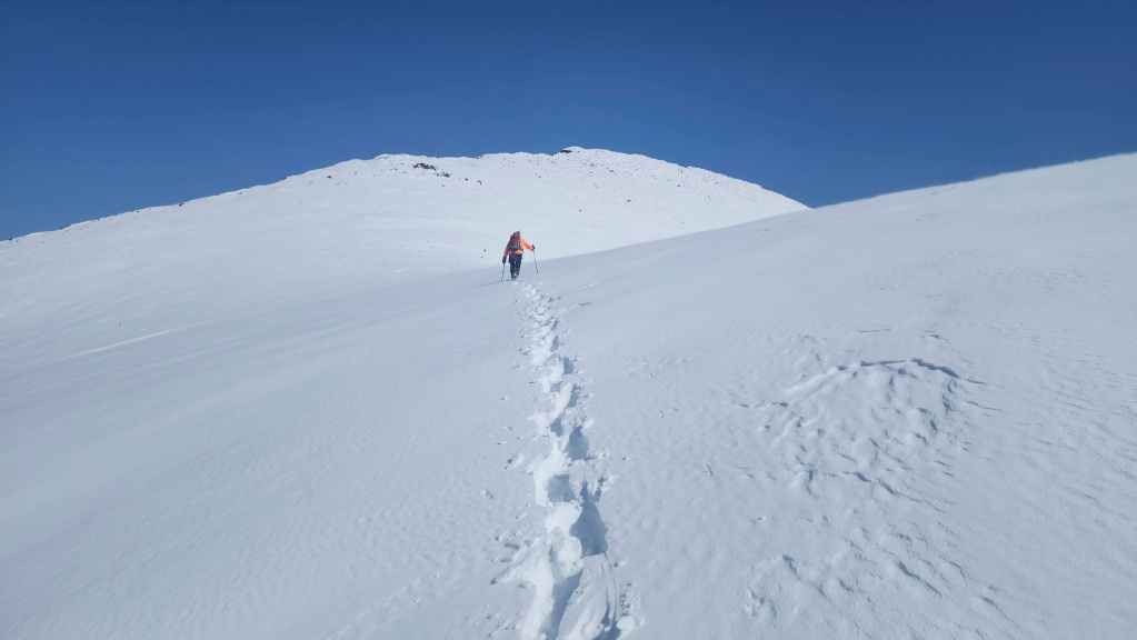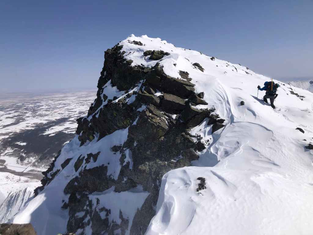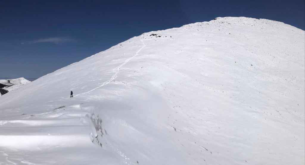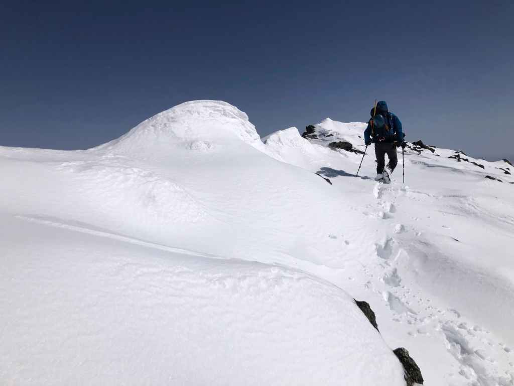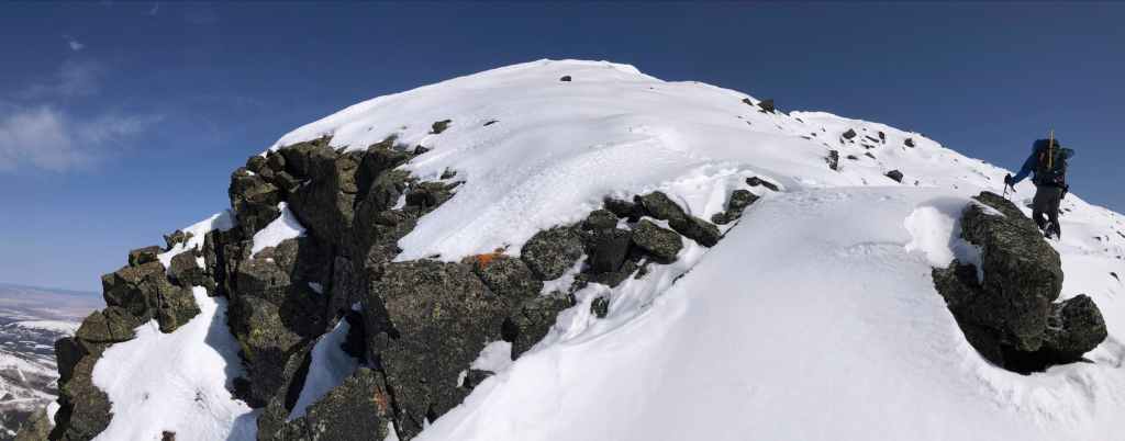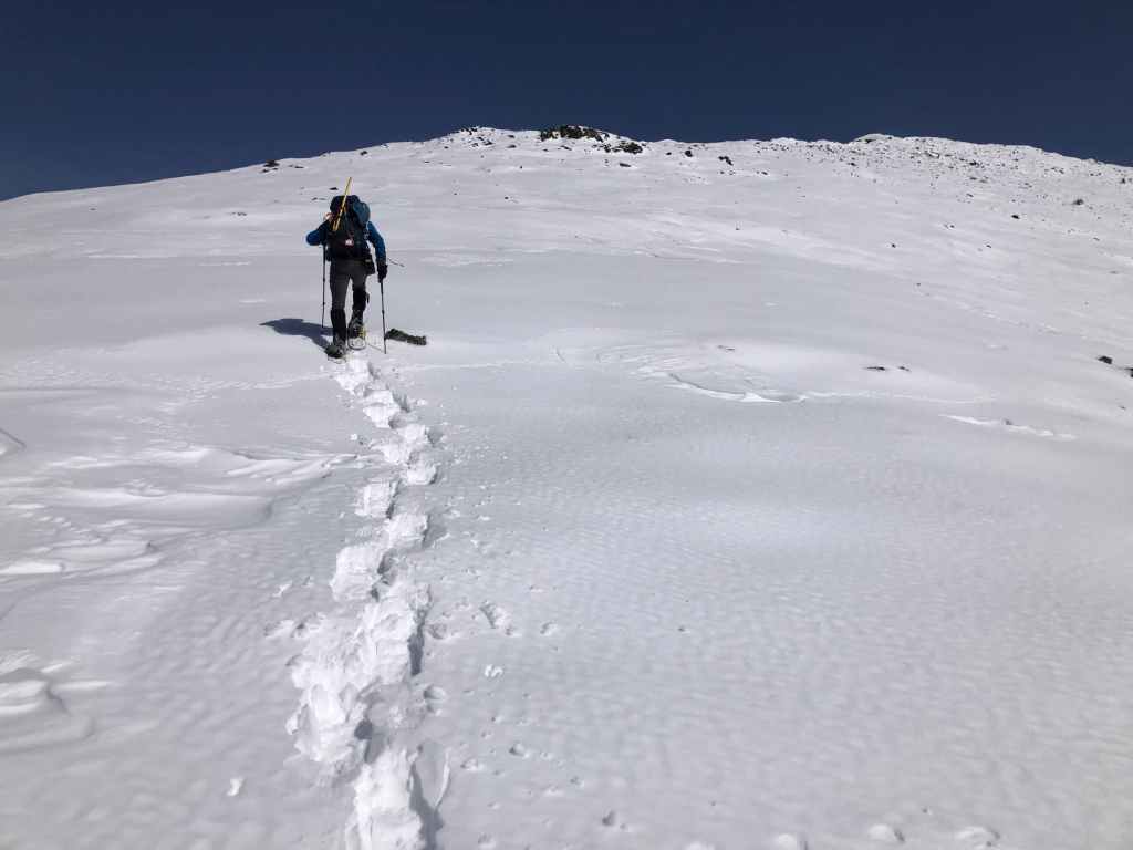 Perhaps the most surprising outcome of our ascent, was that we needed to keep our snowshoes on for the duration. I’d thought for sure that the warm temperatures combined with the wind would have cleared off large sections of snow along the ridge – but it hadn’t. In fact, it was only because of a large boulder field on the summit ridge, that we removed our snowshoes. Navigating the pitfalls hidden beneath the snow was awkward with snowshoes and after falling and bashing my shin, we decided it was time to leave them behind. The remaining few metres to the summit were much quicker with only boots and soon we were enjoying the spectacular winter views.