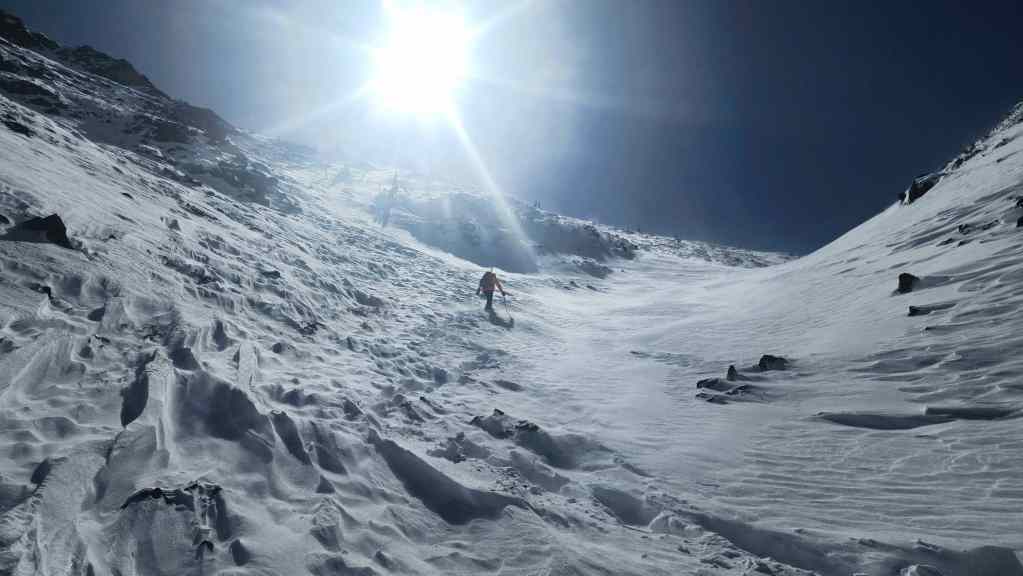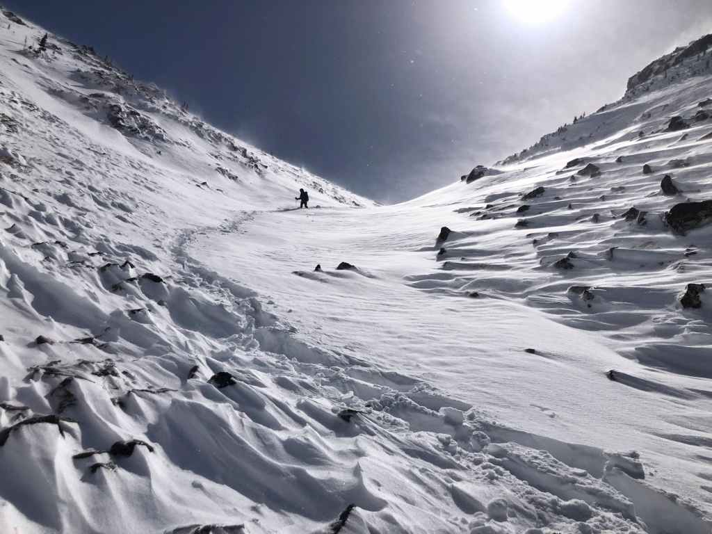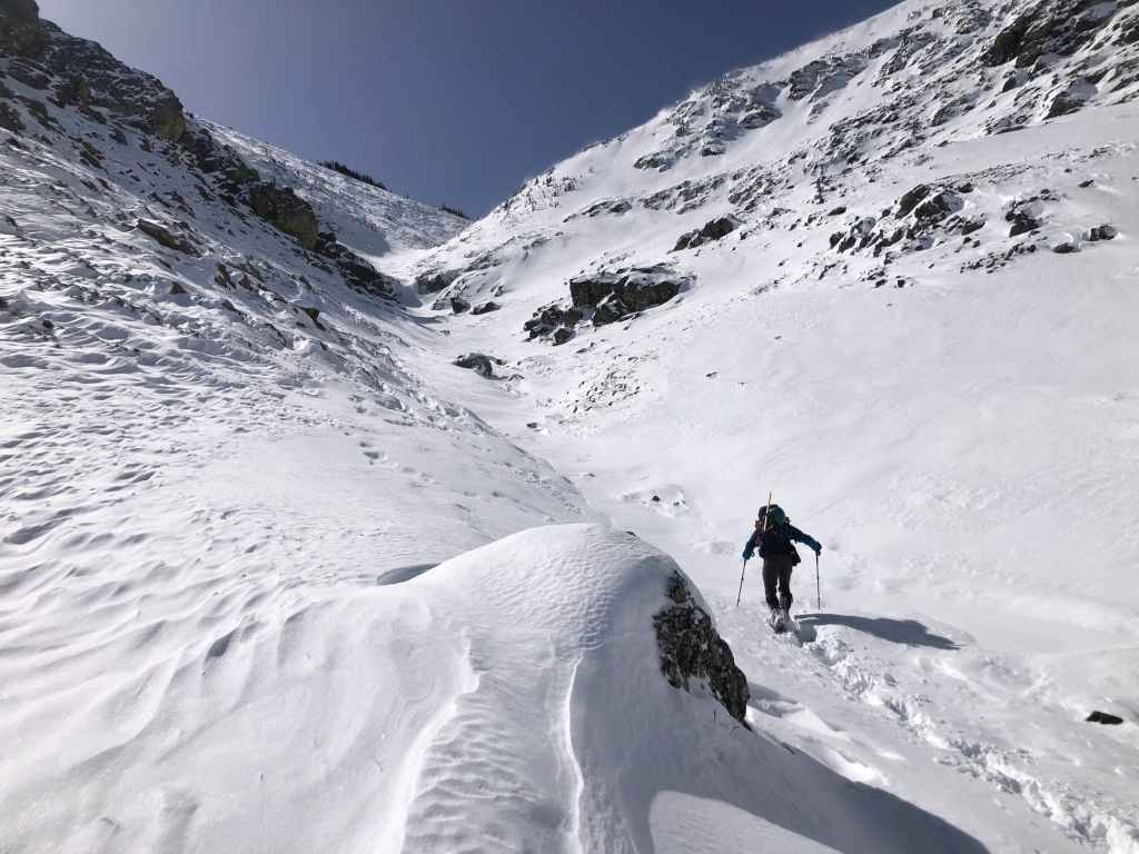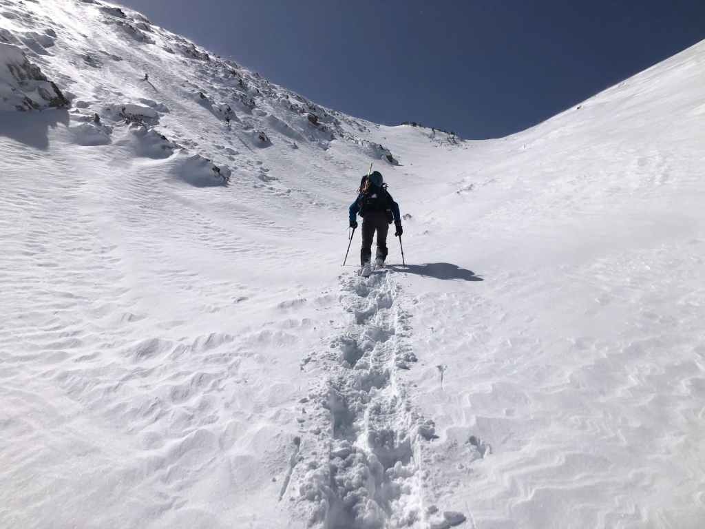 However, after eating a quick lunch in the shelter of a large outcrop, we regained our energy and began our ascent of the drainage, bypassing the small frozen waterfall by scrambling up to climber’s left. Once above, we continued along the drainage until we were at the point where we had to choose what summit we wanted to do.