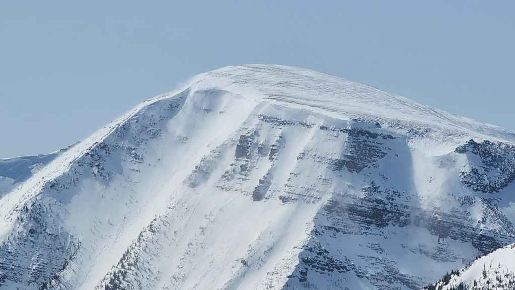 Lots of spindrift on the summits of Loaf Mountain (left of centre) and the Southwest Summit of Drywood (right).