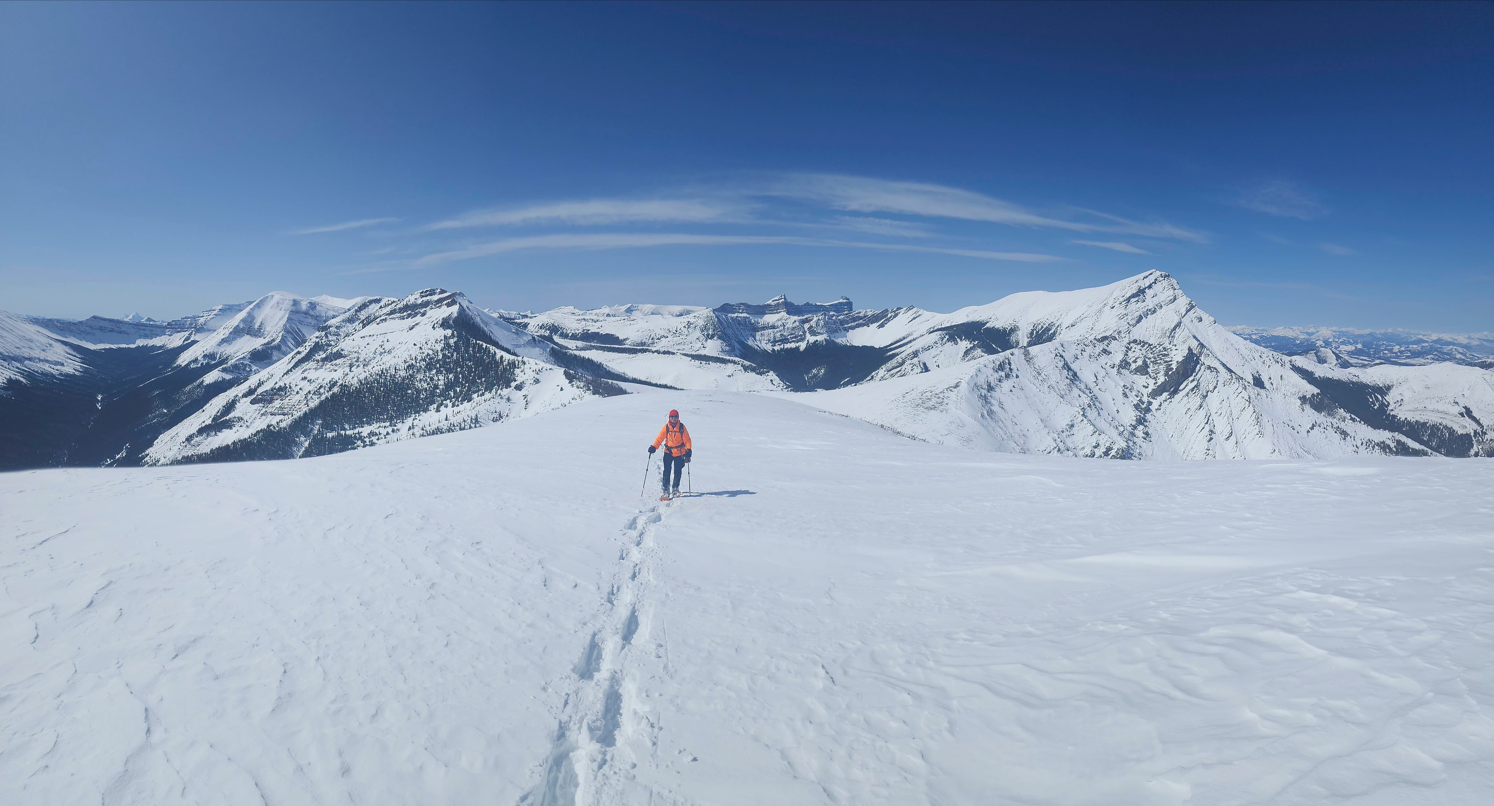 Initially, we’d thought about Pincher’s Centre Peak, but knowing that the fresh snow had no ability to support the required traverse beneath the summit, we concluded that Pincher Ridge would be our objective. No offence to “The Horn”, but on a day with bright blue skies and crisp white snow, the range of scenery offered by Pincher would far surpass that of its respectable outlier.