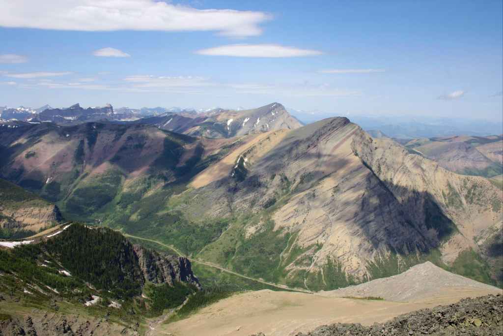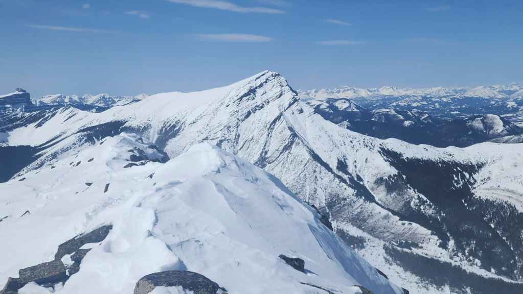 Looking along the ridge toward Pincher’s South Peak (left of centre) and Victoria Ridge (centre).