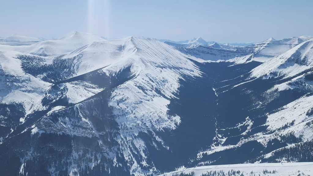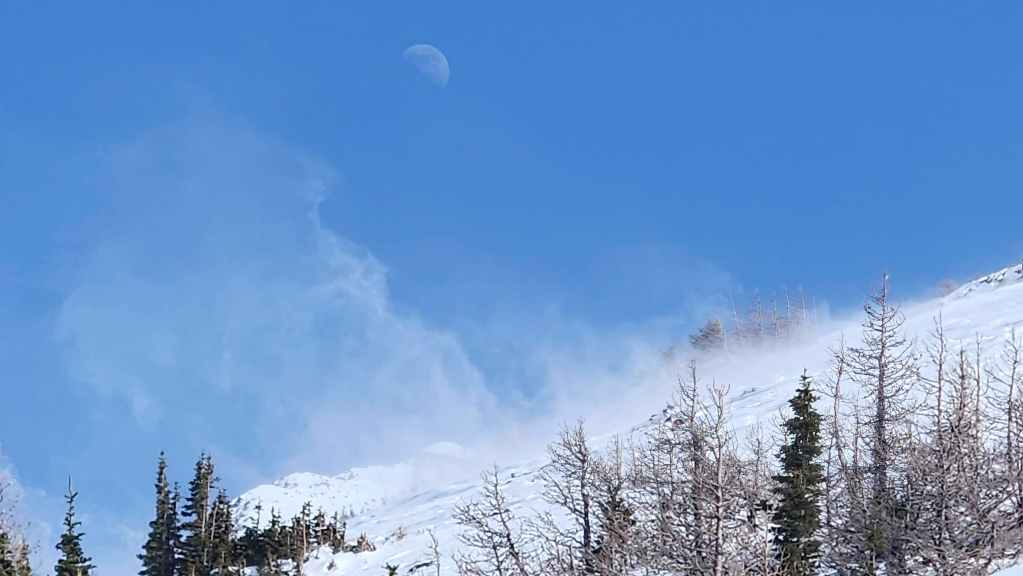 I tried to take a photo of the moon above the summit of Pincher (lower centre) and discovered after-the-fact, that it also included the spindrift photo effect free of charge. 😂