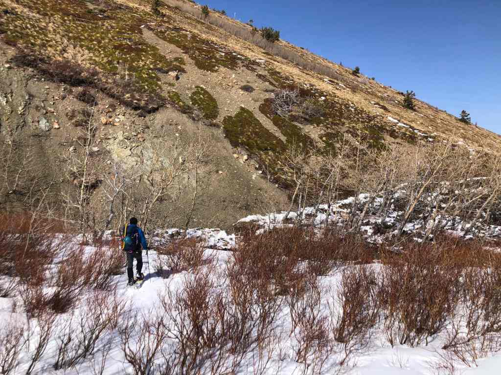 Arriving at the creek and observing that most of the snow from earlier in the day had melted and/or evaporated off of the south slope. (Photo by Andrew Nugara)