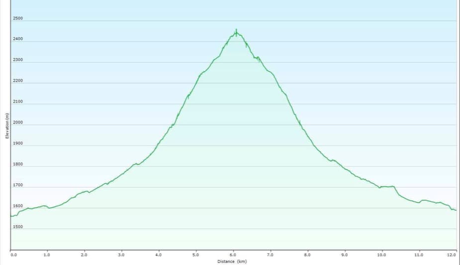 Our total roundtrip distance was 12 km with a total elevation gain of 946 m. Our total roundtrip time was 7 hours and 5 minutes. For reference, from my truck to the summit, it required ~6 km (893 m elevation gain) of snowshoeing over a period of 4 hours and 40 minutes.