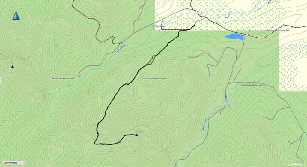 To get to Pincher Ridge we drove north from Waterton National Park on Highway 6 until we reached the Shell Waterton Complex Road (Township Rd. 43A). We then turned onto the road and drove west for ~9.1 km until we came to a junction with a gravel road near to the entrance of the plant. Here, we turned left and onto the gravel road where we continued for ~4.8 km until we came to a junction with a gas road on our left, just past Butcher Lake. We then turned left and followed the road upwards for ~300 m until we arrived at a well site. Here is where we parked and where the trailhead began.