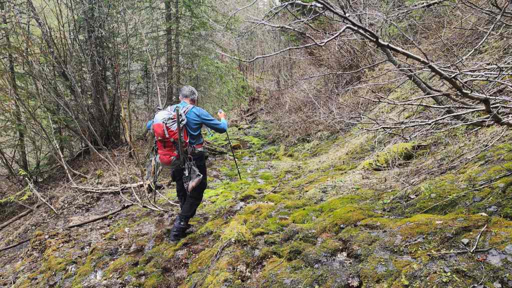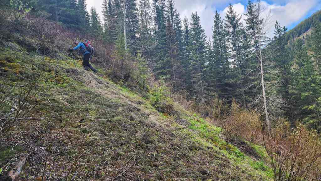 Andy leads the way. Outside of some light bushwhacking through through the alders in the centre, most of our route onto the ridge was clear. The only deadfall we encountered was small and easily avoidable.