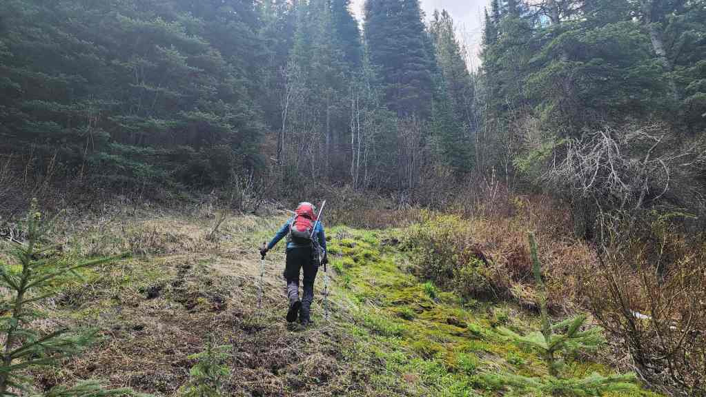 From the start of the logging road, we hiked for ~1 km until the road came to an abrupt and overgrown end. We noticed that a small trail continued through the overgrowth, so we followed it for a further ~145 m or so, until we came to an obvious clearing on our left. Concluding that this looked to be the best place to begin our ascent since starting along the road, we proceeded to head up the slope.