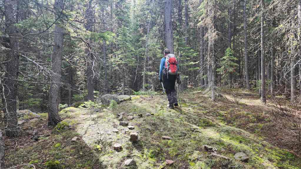 After following the trail for ~140 m, we came to a small clearing to climber’s left. This opening presented the best option for ascent that we’d seen so far, so we made the decision to leave the trail.