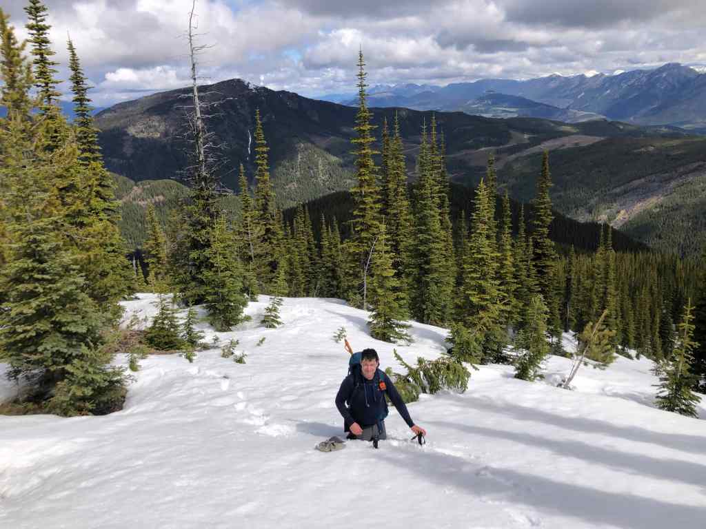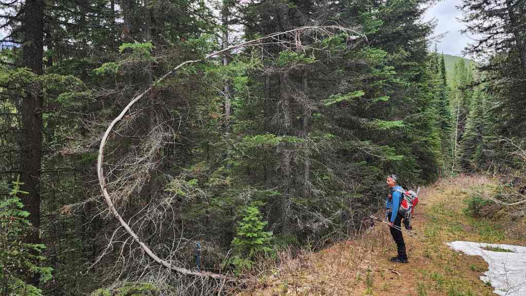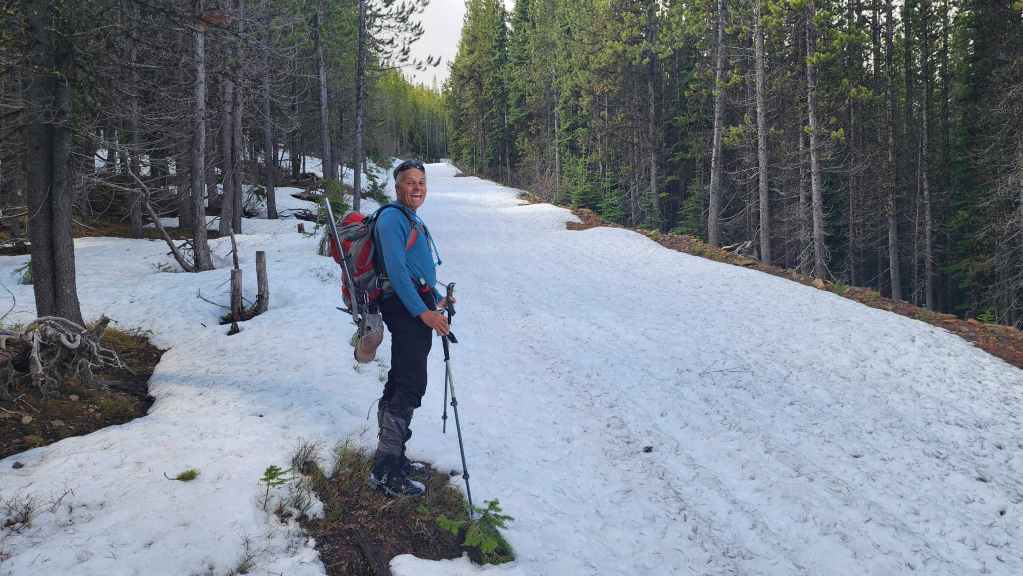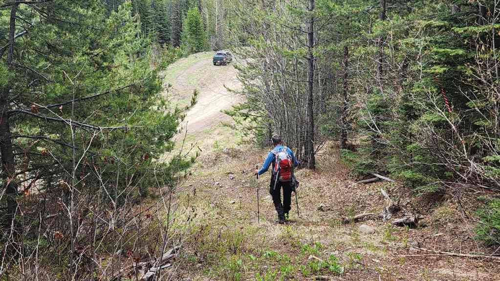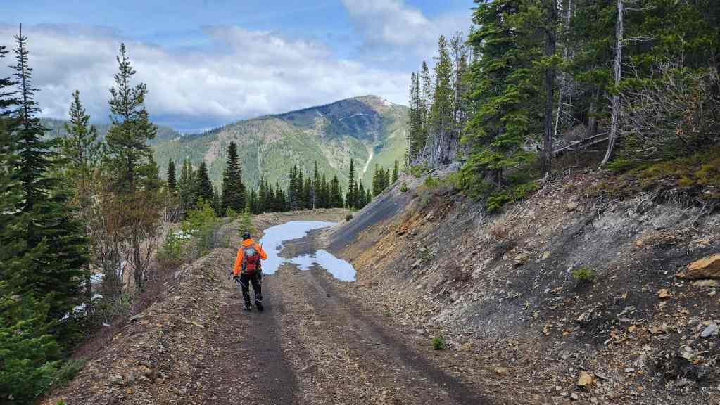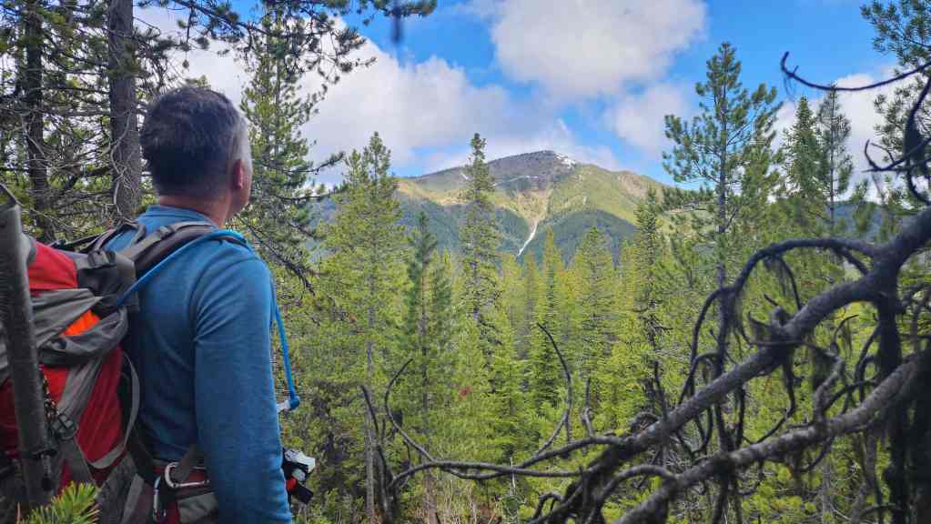 Gearing up on Wheeler Creek Road with the summit of Sparwood Ridge in the background. The old logging road that we’ll start on, is in the trees directly behind Andy.