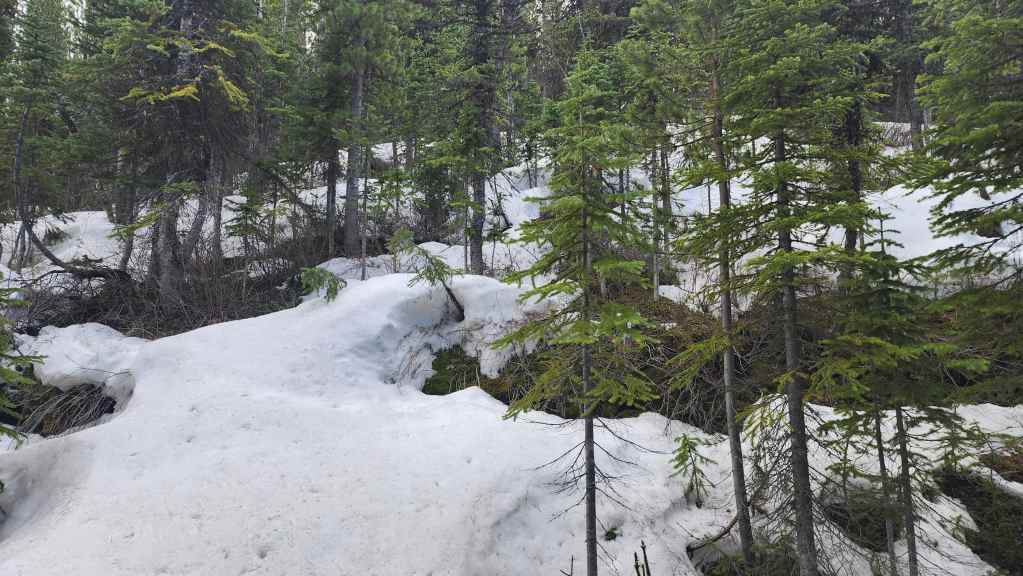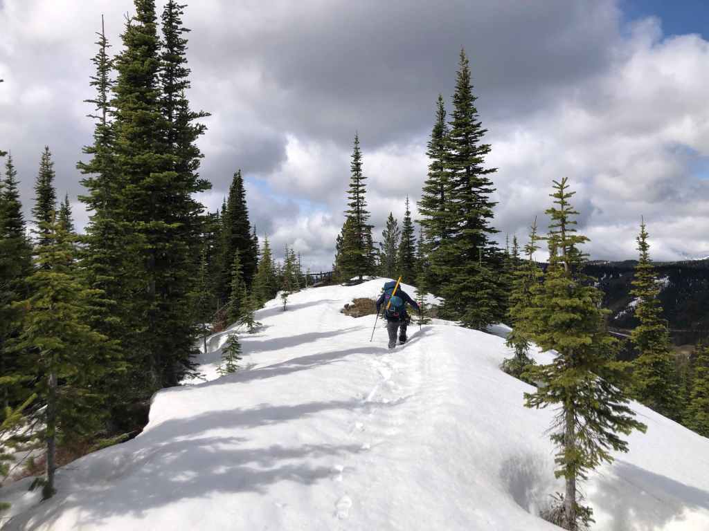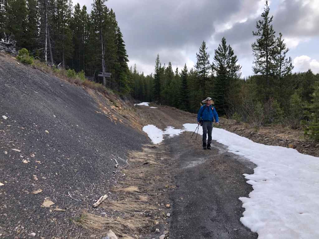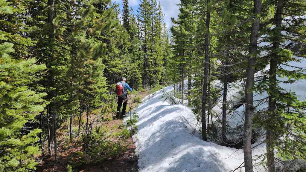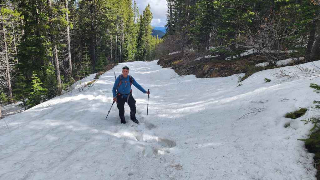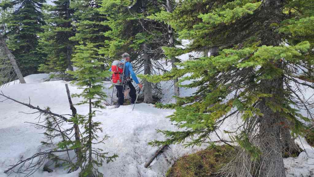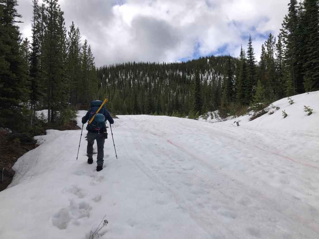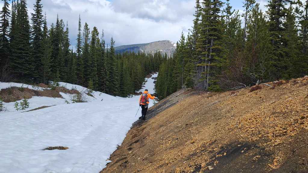 However, not knowing where the old road led, we chose to continue along the ridge and through the snow. Fortunately, the post-holing wasn’t as bad as it looked to be and the terrain soon levelled out.