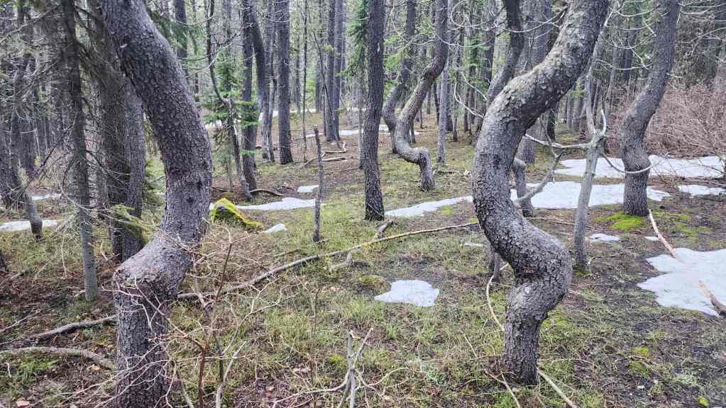 A cluster of oddly-shaped trees. As they all looked to be bent in the same place and appeared to be roughly the same age, I wonder if it was disease, pestilence, or an environmental factor that caused this?