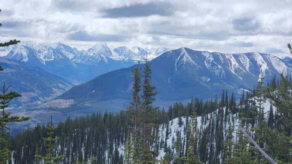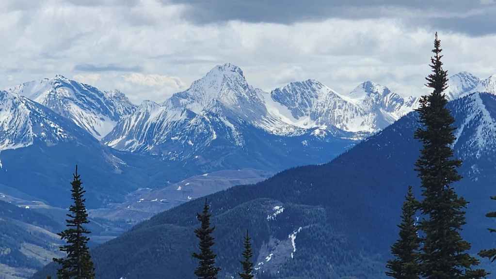 Now looking at the south end of the High Rock Range with Mount Tecumseh (right), Phillipps Peak (right of centre), Omahkai’stoo (Crowsnest Mountain) (centre), and “Shooting Star Peak” (far left behind the tree) all visible. The low ridge in the foreground is Loop Ridge.