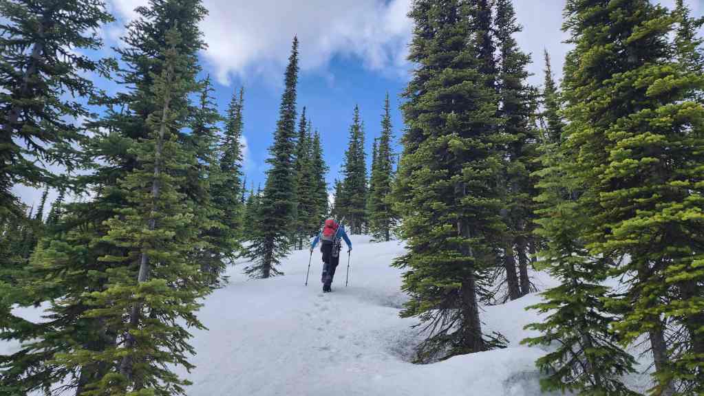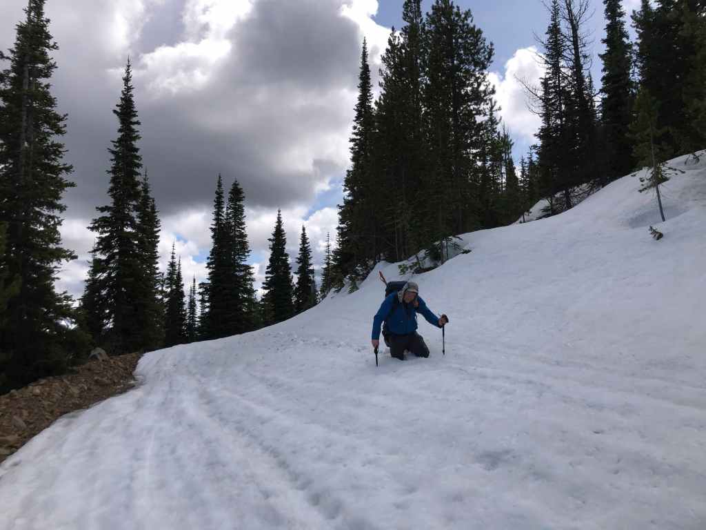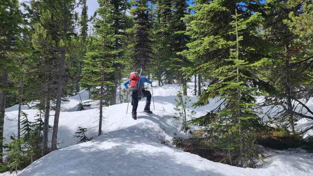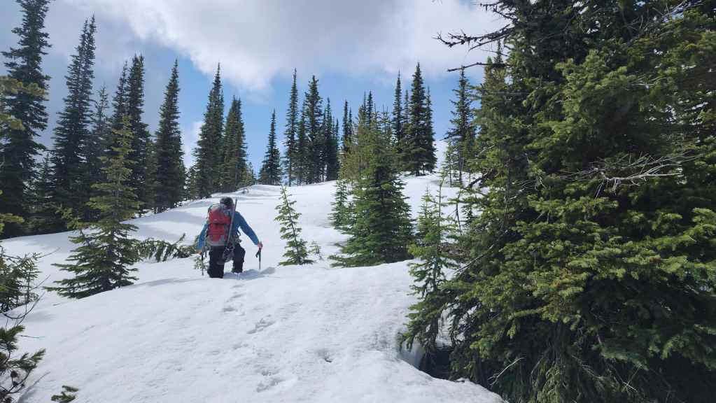 The snow consolidated as we gained elevation, allowing us to walk on top of it – well most of the time. 😂 This is what we were hoping for because otherwise, it would have been an awful slog through waist-deep snow.