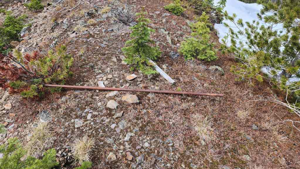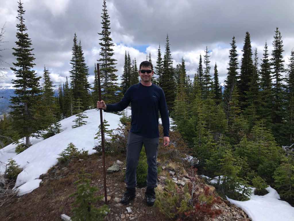 Arriving on the summit, we found an old iron pole, marker wood, and an iron survey pin. This confirmed to us that we were on the official summit of Marten Ridge. For reference, from the start of our hike at Wheeler Creek Road to the summit, it was a ~4.4 km (679 m elevation gain) hike over a time of 2 hours and 42 minutes. Had we not encountered snow, that time would have been shortened.