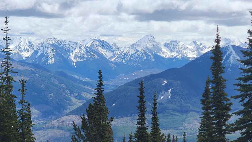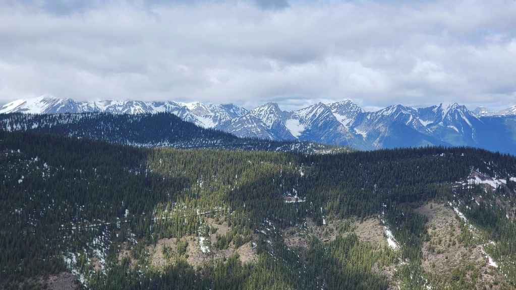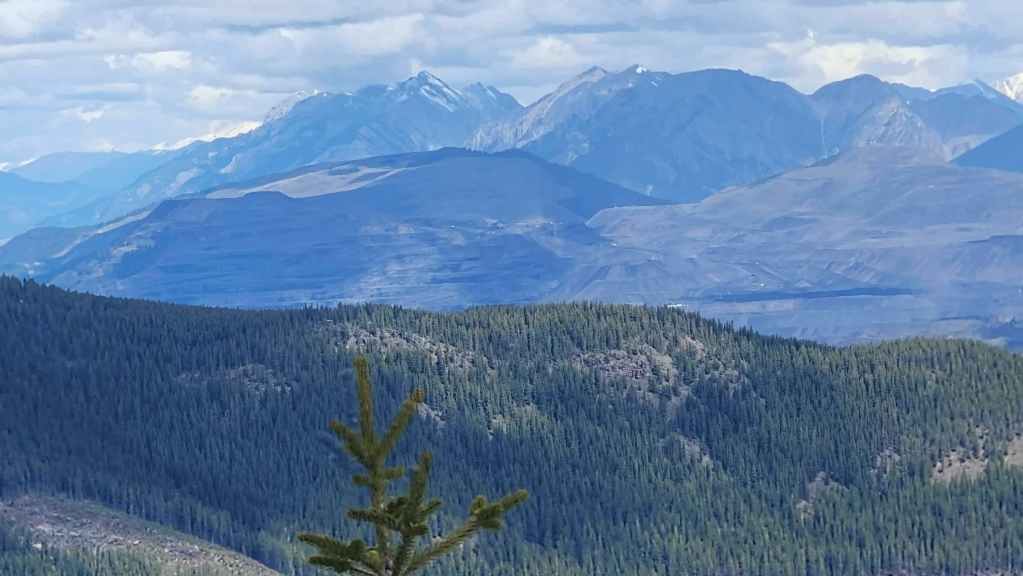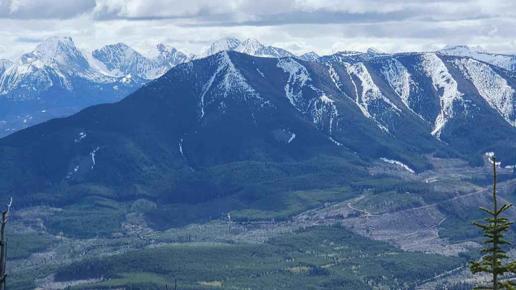 Looking overtop of the TECK mine on Natal Peak (centre) at Sheep Mountain (right of centre), Mount Salter (right of centre) and Mount Lyne (left of centre).