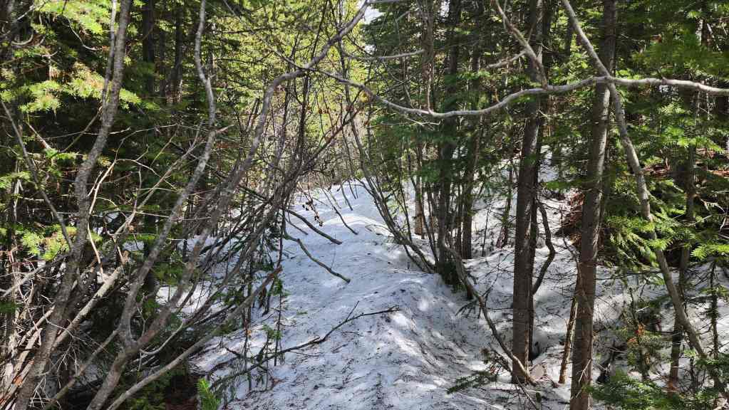 As we neared the top of the previous photo’s section of steep terrain, we came across a very old logging road – along with an abrupt coverage of snow. We didn’t know it at the time, but had we fought our way westward (climber’s right) through the undergrowth for ~160 m, the old road would have led us onto an amazing road that we could have easily followed for ~1 km to the base of the summit.