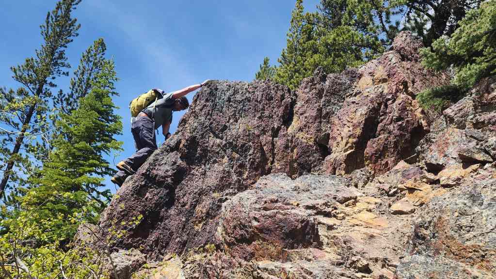 Brad climbs an easily avoidable rock band. (Photo by Andrew Nugara)