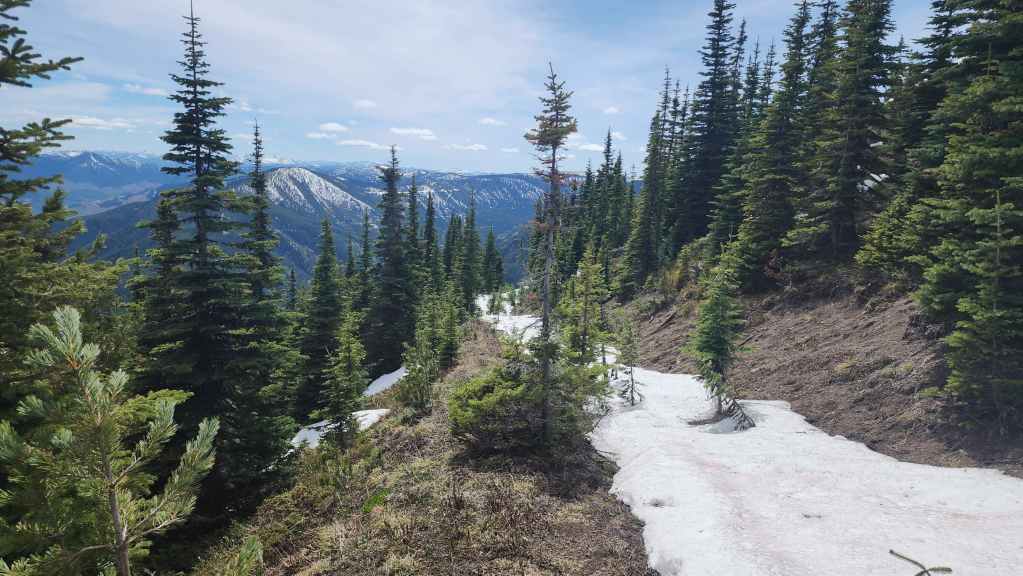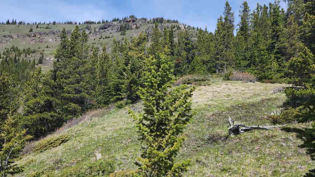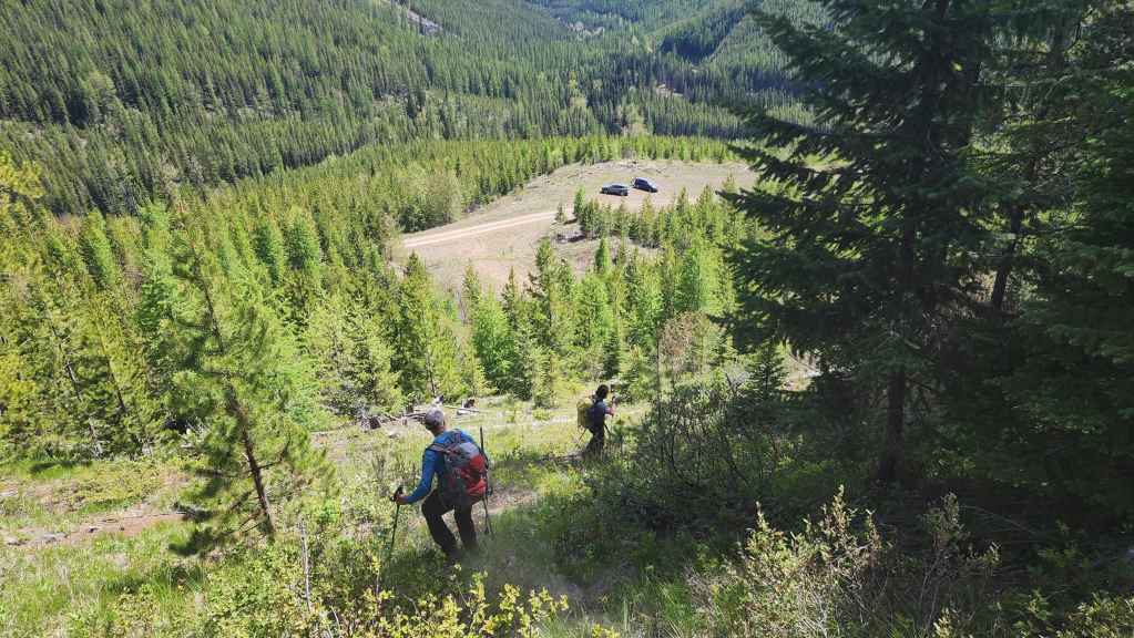 After relaxing for ~40 minutes on the summit, we dropped more or less straight down the east slope of Sparwood until we arrived in the clearing and on the road that we could have started from. To confirm that it led back to our vehicles, we followed it to where it joined with the main branch and then back to our starting point. So, yes, the clearing is the better place to start.
