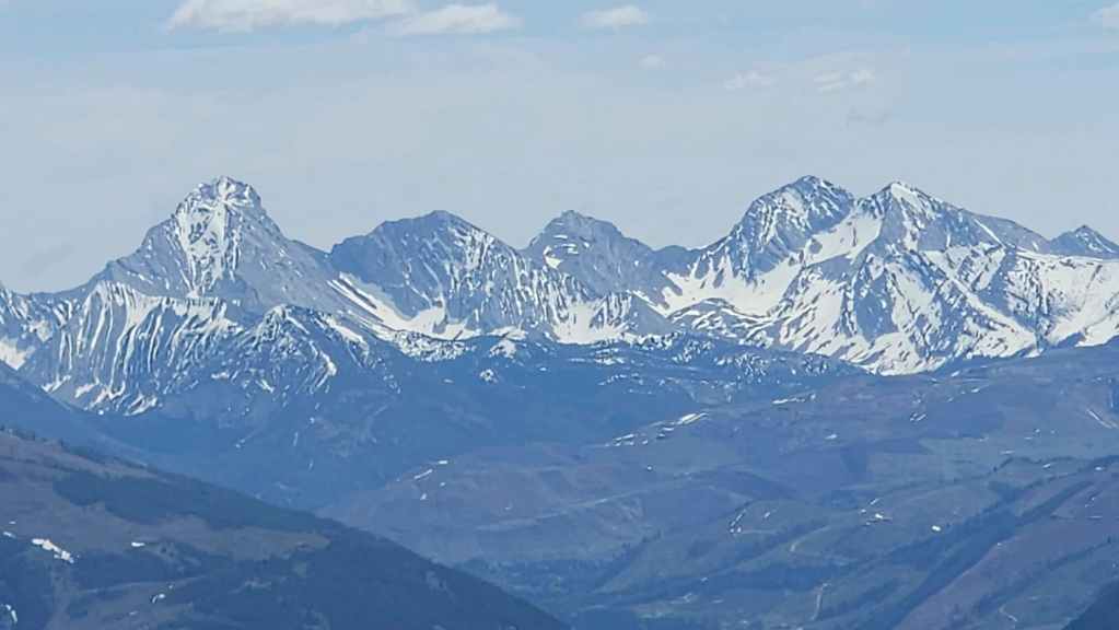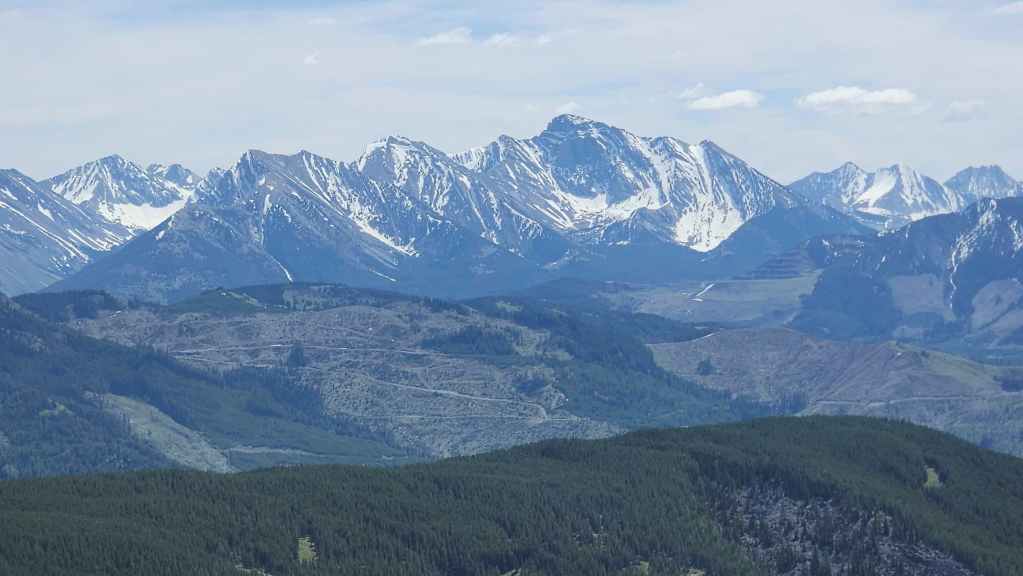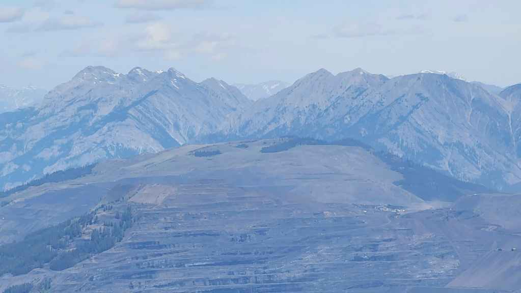 Gazing along the Elk Valley at Natal Peak (foreground) at Mount Lyne, Mount Salter, and Sheep Mountain (all left of centre) and also at Gaff Peak (right of centre).