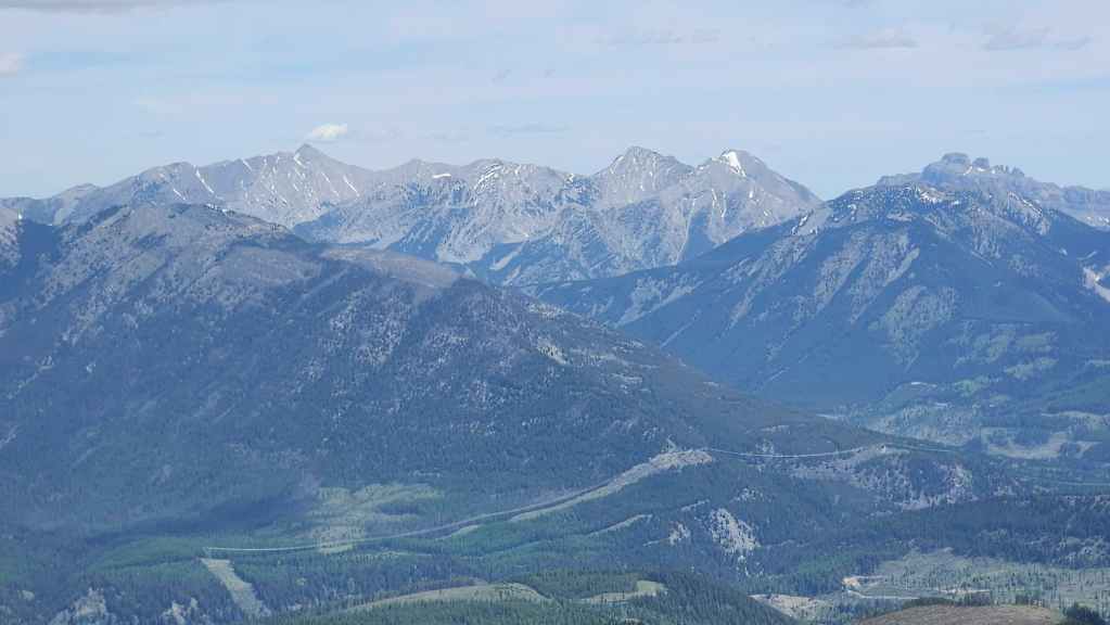 The view from the summit allows you to look across the Crowsnest Pass to the Alberta side. The South Peak of the Livingstone (far left), Bluff Mountain (centre), and the summit of Crowsnest Ridge (left) are all visible.
