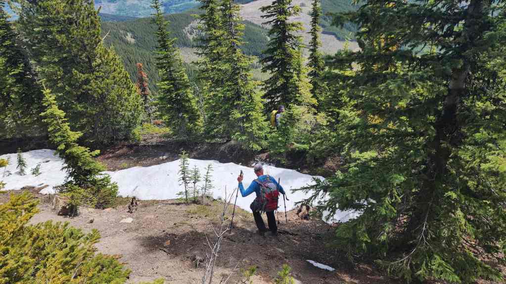 To descend, we decided to follow Sparwood’s east ridge for a short distance before heading straight down the southeast slope. Back in February 2022, Raff, Bert, and I snowshoed the east ridge as part of our ascent.