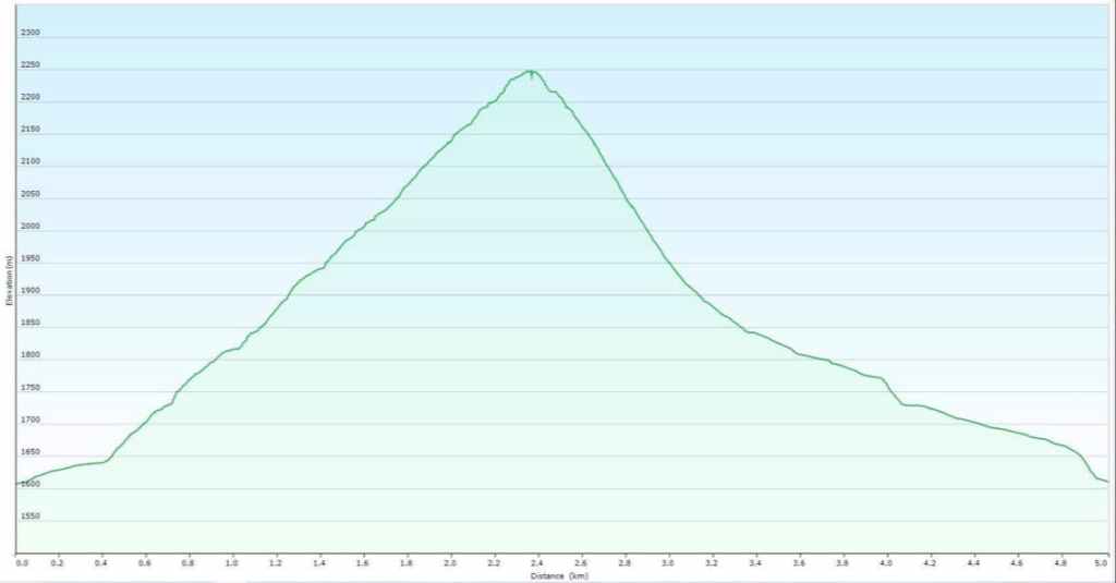 Our total roundtrip distance was 5.7 km with a total elevation gain of 642 m. For reference, it took us exactly 2 hours from our vehicles to the summit with an elevation gain of 640 m. Our total roundtrip time was 3 hours and 40 minutes.