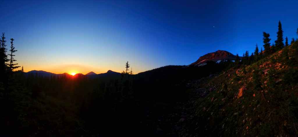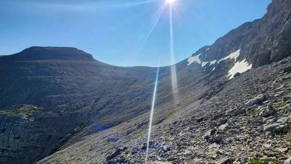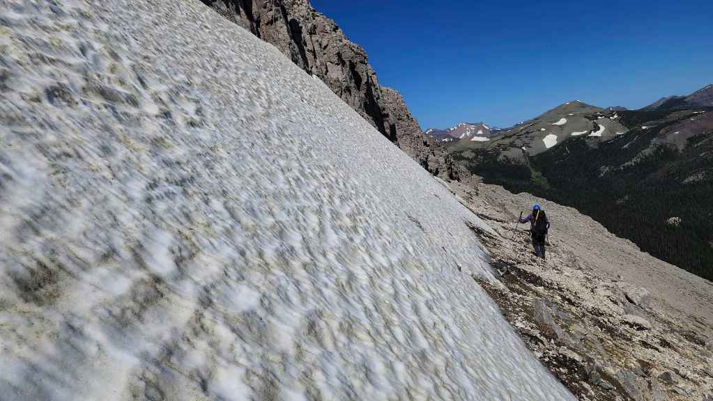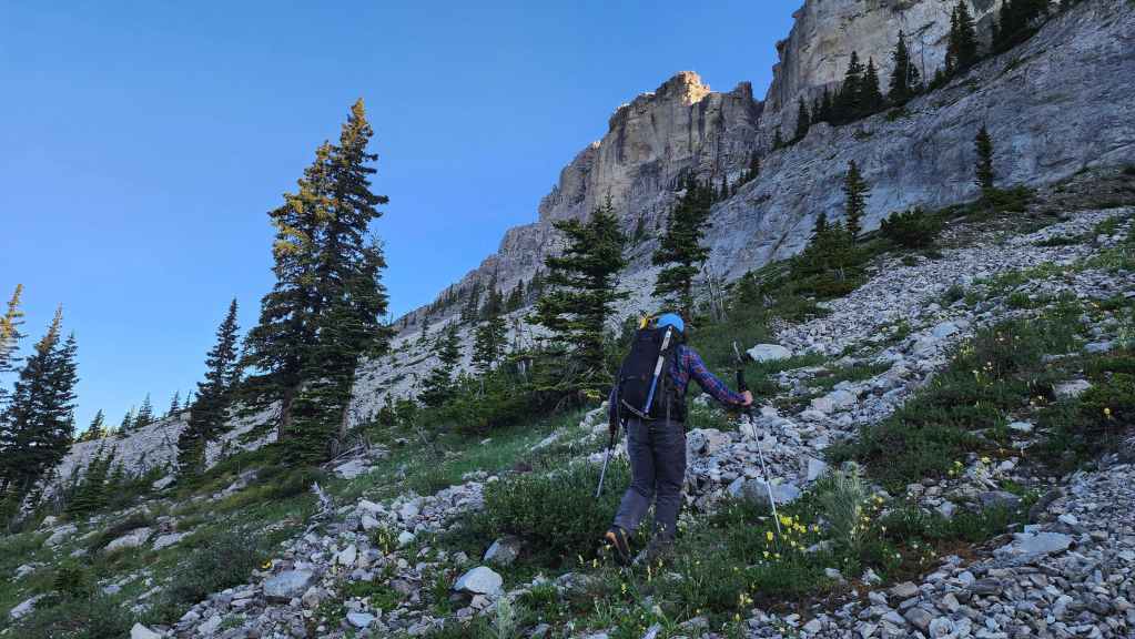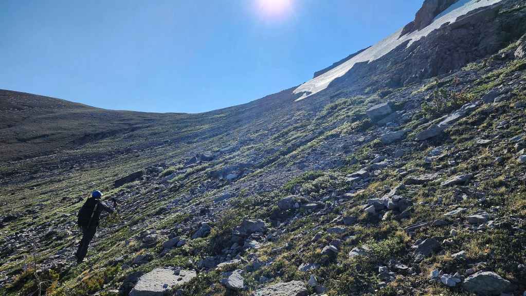 After 10 minutes or so, we arrived at a large open slope. As this was the closest the GDT came to the mountain, we decided to make a traverse to gain elevation until we joined Cornelius’ scramble route on the west side of the mountain.
